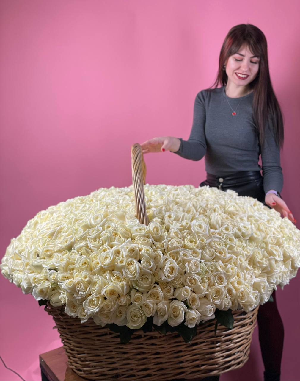 Тысяча и одна роза собраны в объёмную корзину, где каждый белоснежный бутон создаёт плотное облако лепестков. Это композиция, которая заполняет пространство и меняет восприятие комнаты одним своим присутствием.
