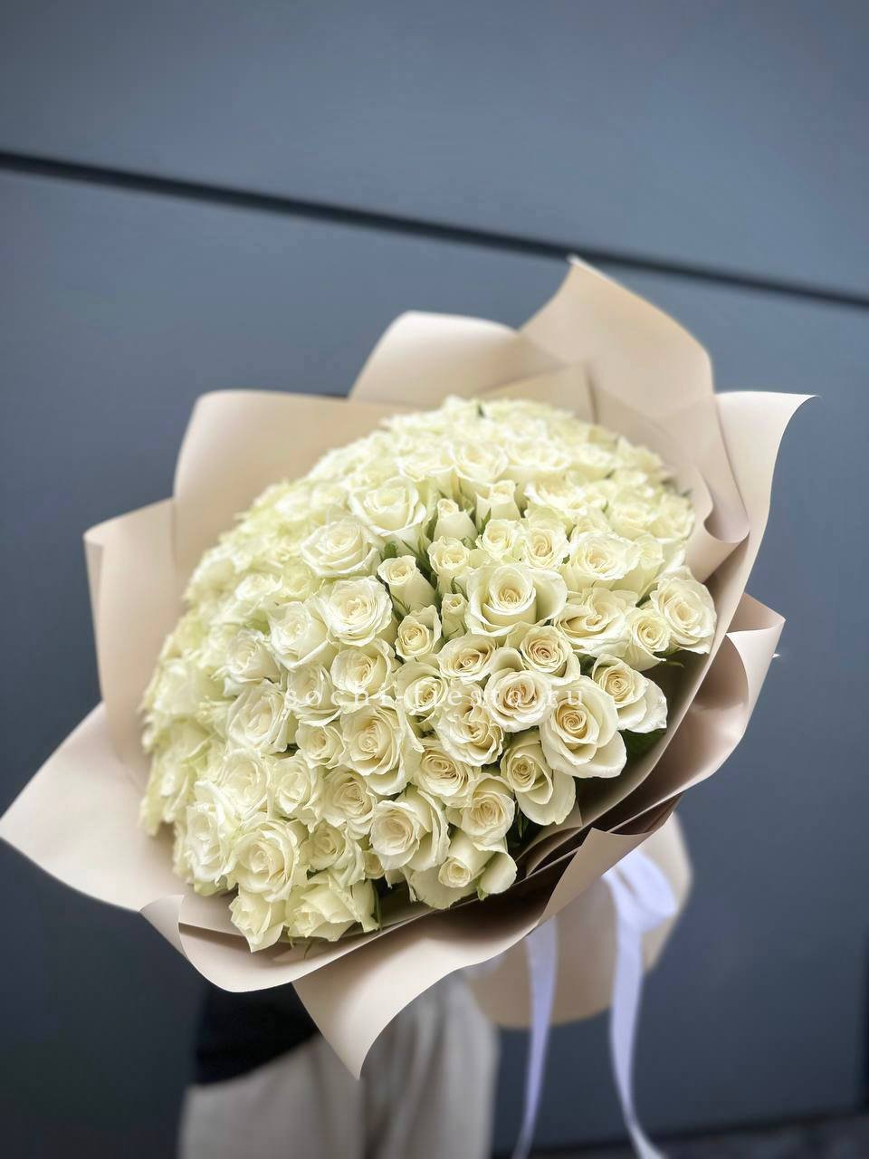101 белая роза, лента, упаковка на выбор.