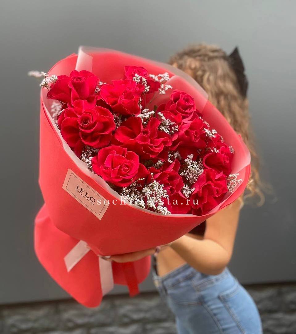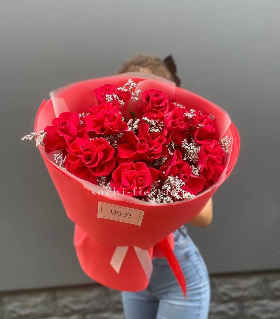 15 роз сорта джумилия, лента, дизайнерская упаковка.