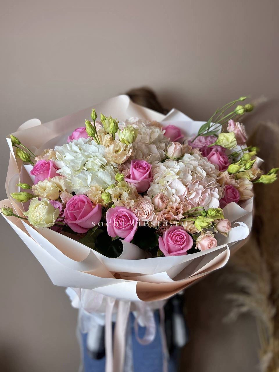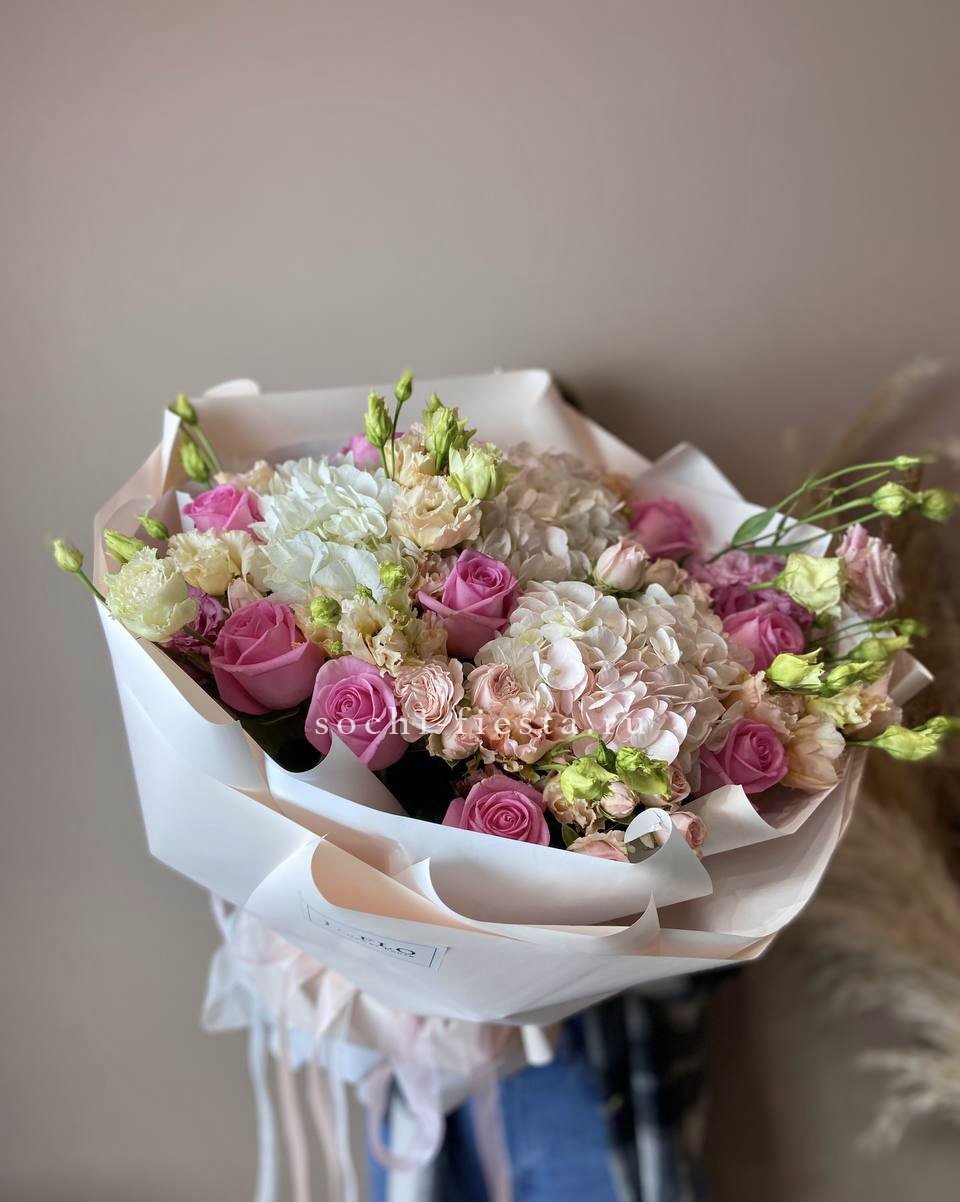 гортензия, розовые розы, пионовидные розы, диантус, эвкалипт, лента, сумка-кашпо.