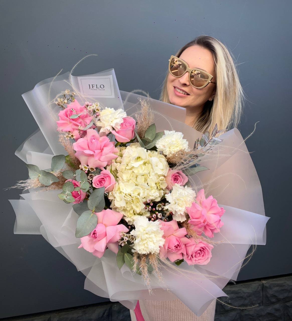 Пышная гортензия задаёт объём, а розы и диантусы наполняют композицию мягкими переходами оттенков. Эвкалипт добавляет воздушности, не перегружая форму. Букет собран так, чтобы каждый цветок читался отдельно, но работал на общую картину.