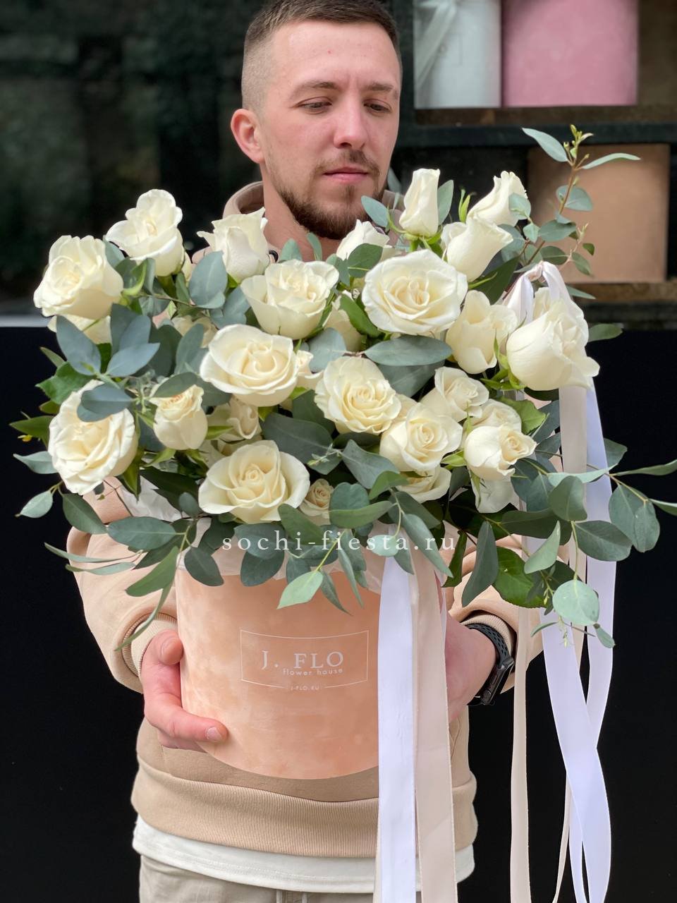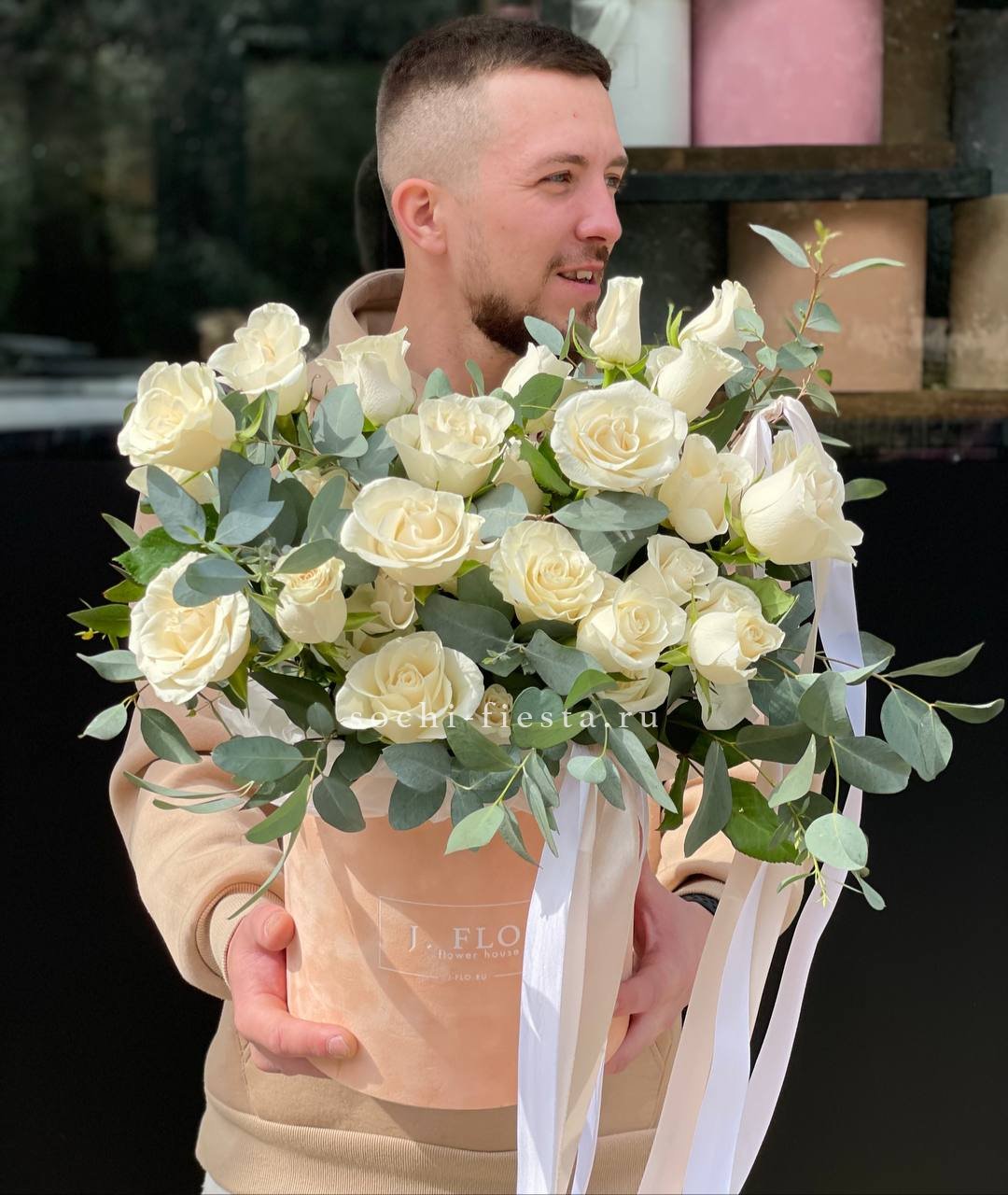 Пышная композиция в круглом боксе объединяет розы, эустому, хризантемы и диантус в плотную цветущую массу. Бомбастик добавляет объёма, а эвкалипт смягчает переходы между соцветиями. Готовое решение для размещения на столе или комоде.