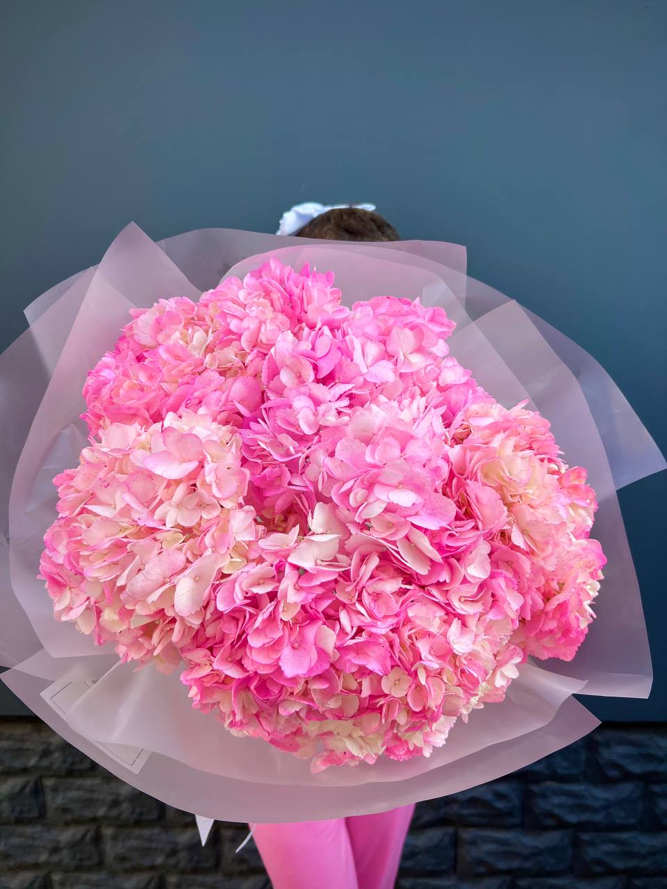 Три пышных шапки голубой гортензии образуют округлую форму с естественной асимметрией. Каждое соцветие раскрыто полностью, создавая впечатление объёмного облака в руках.