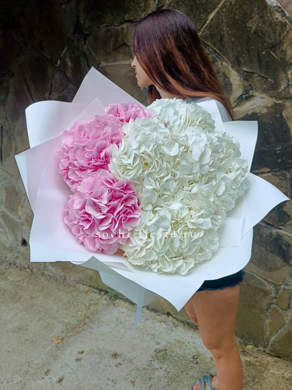 гортензия (розовая, белая) - 7 шт., лента, дизайнерская упаковка.