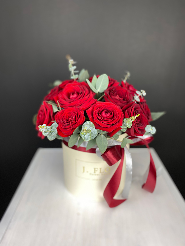 Красные розы с бархатистыми лепестками раскрываются постепенно, обнажая густую сердцевину. Каждый бутон плотный и выразительный, создавая объёмную текстуру всей композиции.