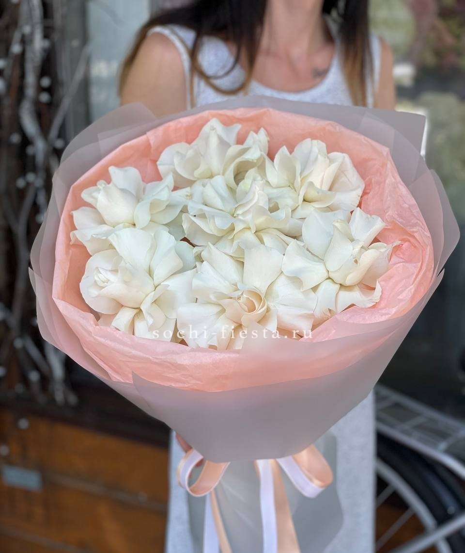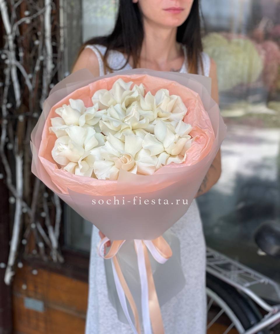 Пионовидные розы раскрываются густыми лепестками, хамелациум добавляет воздушности. Композиция держит форму и долго сохраняет свежесть.