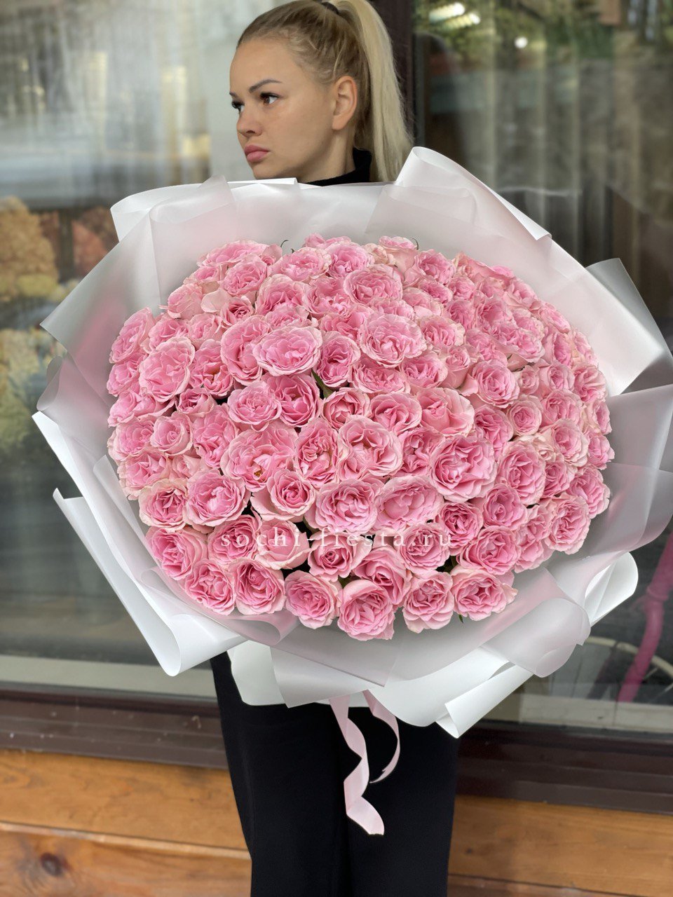 роза белого и розового оттенка 555 шт., оформление в каркас или корзину.