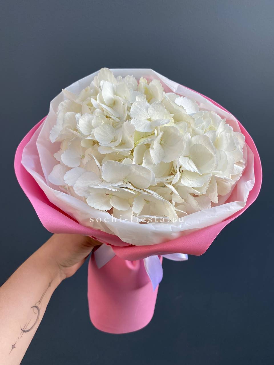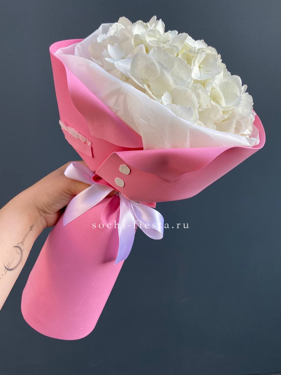 гортензия розовая 9шт., лента, дизайнерская упаковка. Цвет гортензий может незначительно отличаться.