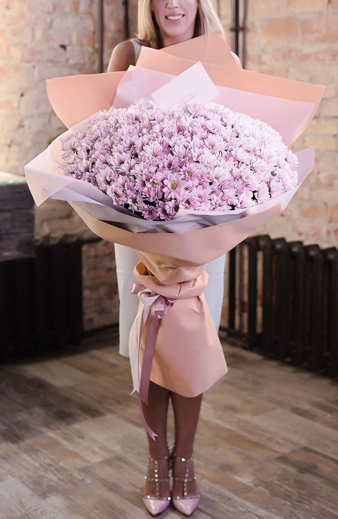 хризантема кустовая - 17 веток, тишью, дизайнерская упаковка, лента.