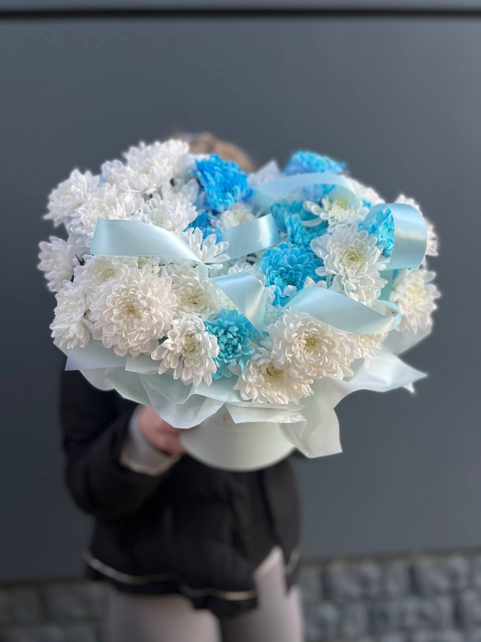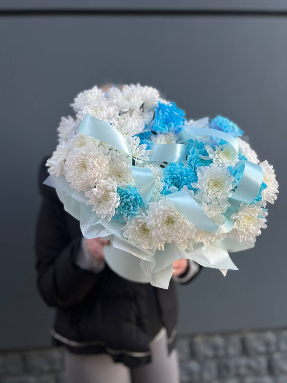 Сорок один бутон собран в плотное соцветие. Хризантемы формируют округлый силуэт с равномерным ритмом и чистой графикой. Монохромное решение с выразительной структурой.