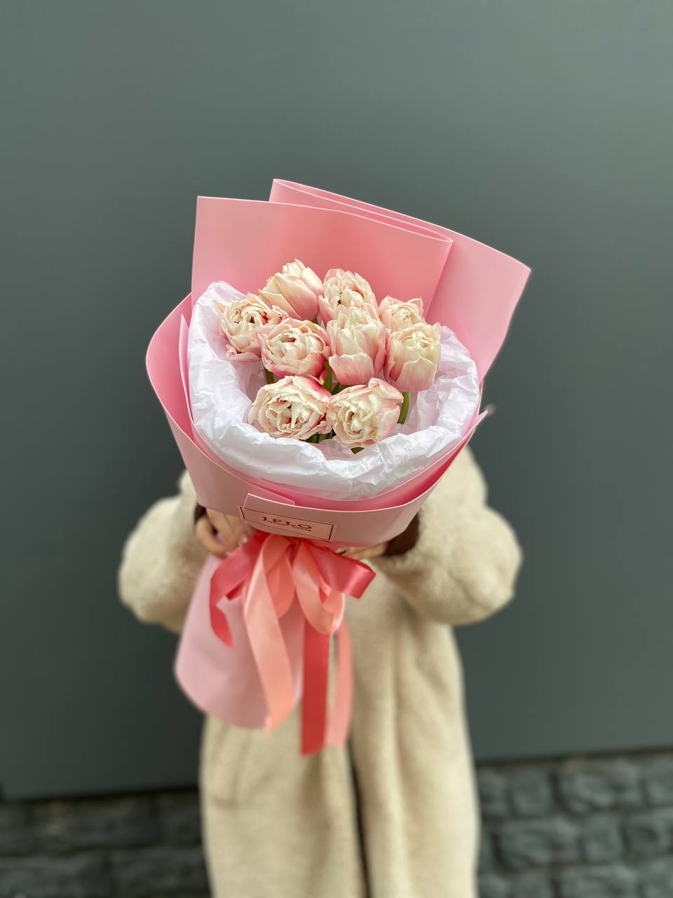 Девять тюльпанов в розовой гамме собраны в лаконичную композицию с мягким обрамлением. Бутоны держат форму и создают спокойный цветовой акцент в любом пространстве. Монобукет для тех, кто ценит простоту без лишних деталей.