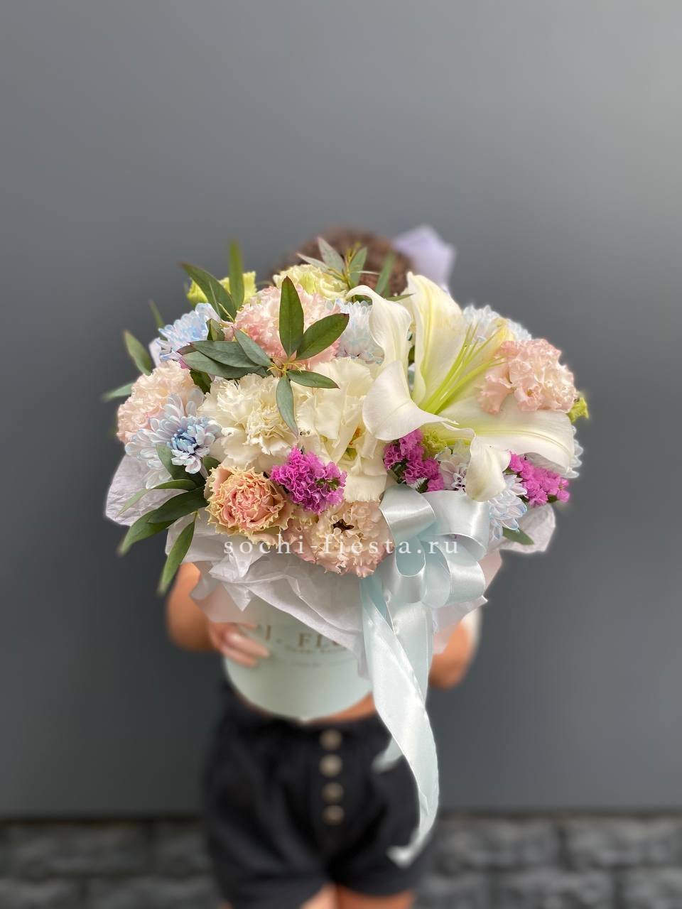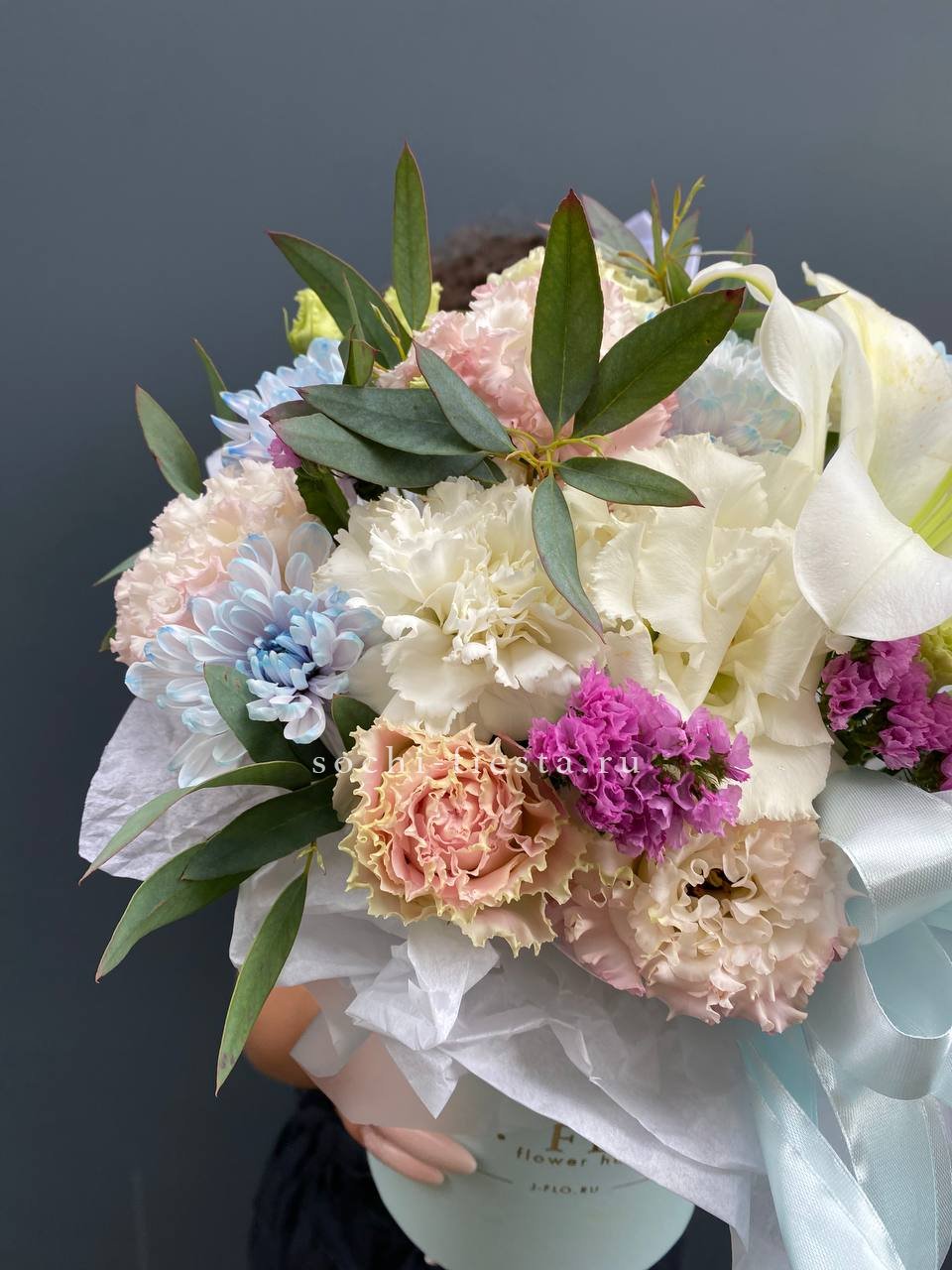 лилии, диантусы, хризантемы, эустома, статица, эвкалипт, цилиндр.