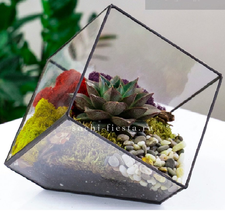 флорариум в кашпо Усеченный куб идеален для подарка искушенным и практичным личностям. Растение неприхотливо в уходе, композиция стильно смотрится в любом пространстве:)