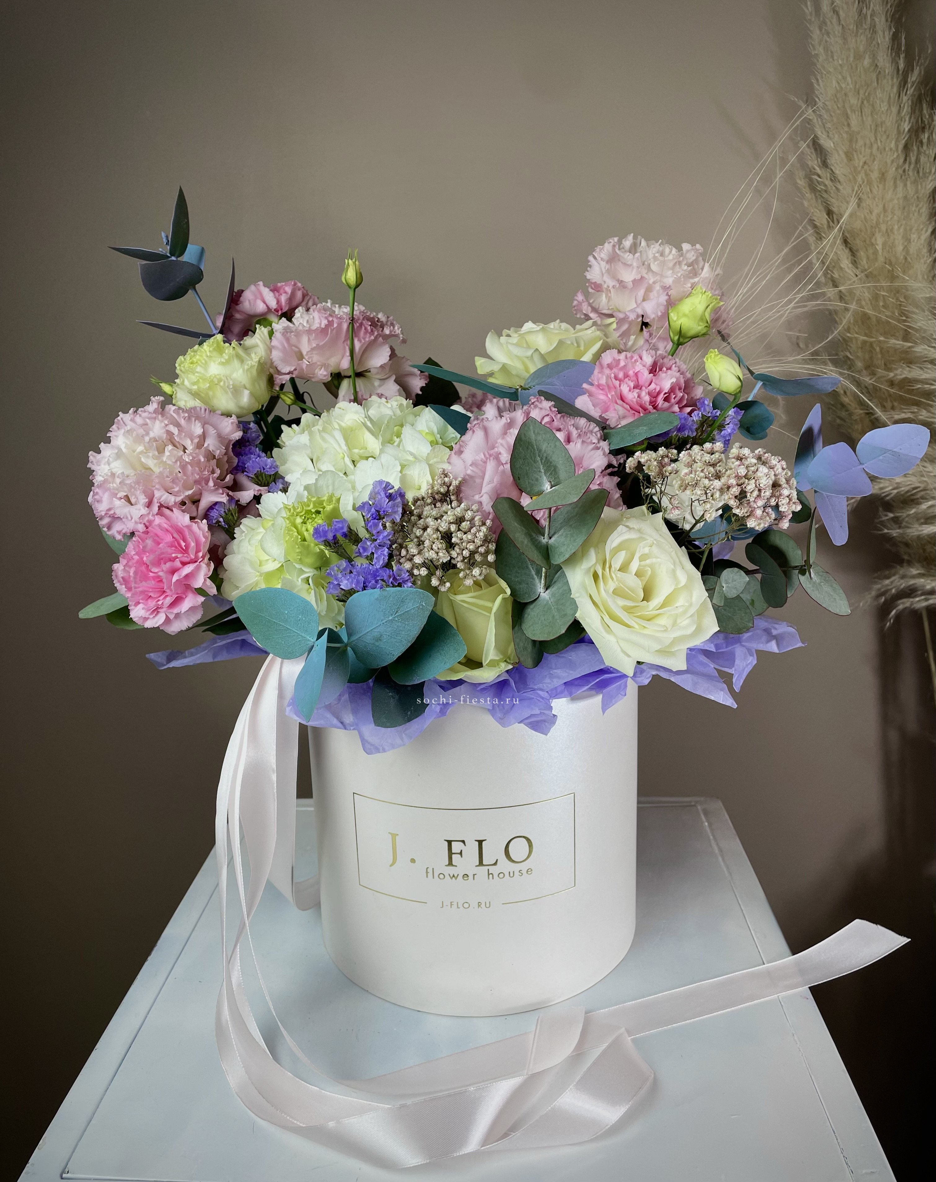 бокс 16, гортензия, роза, эустома, лилия, статица, лагурус.