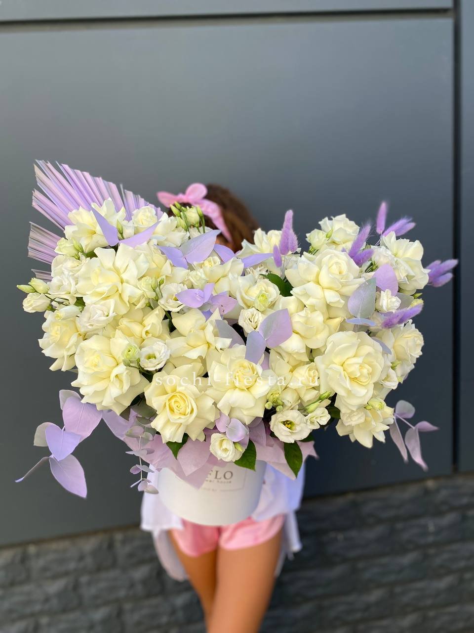Белые французские розы раскрываются крупными бутонами и соседствуют с воздушной эустомой. Композиция создает ощущение легкости и света.