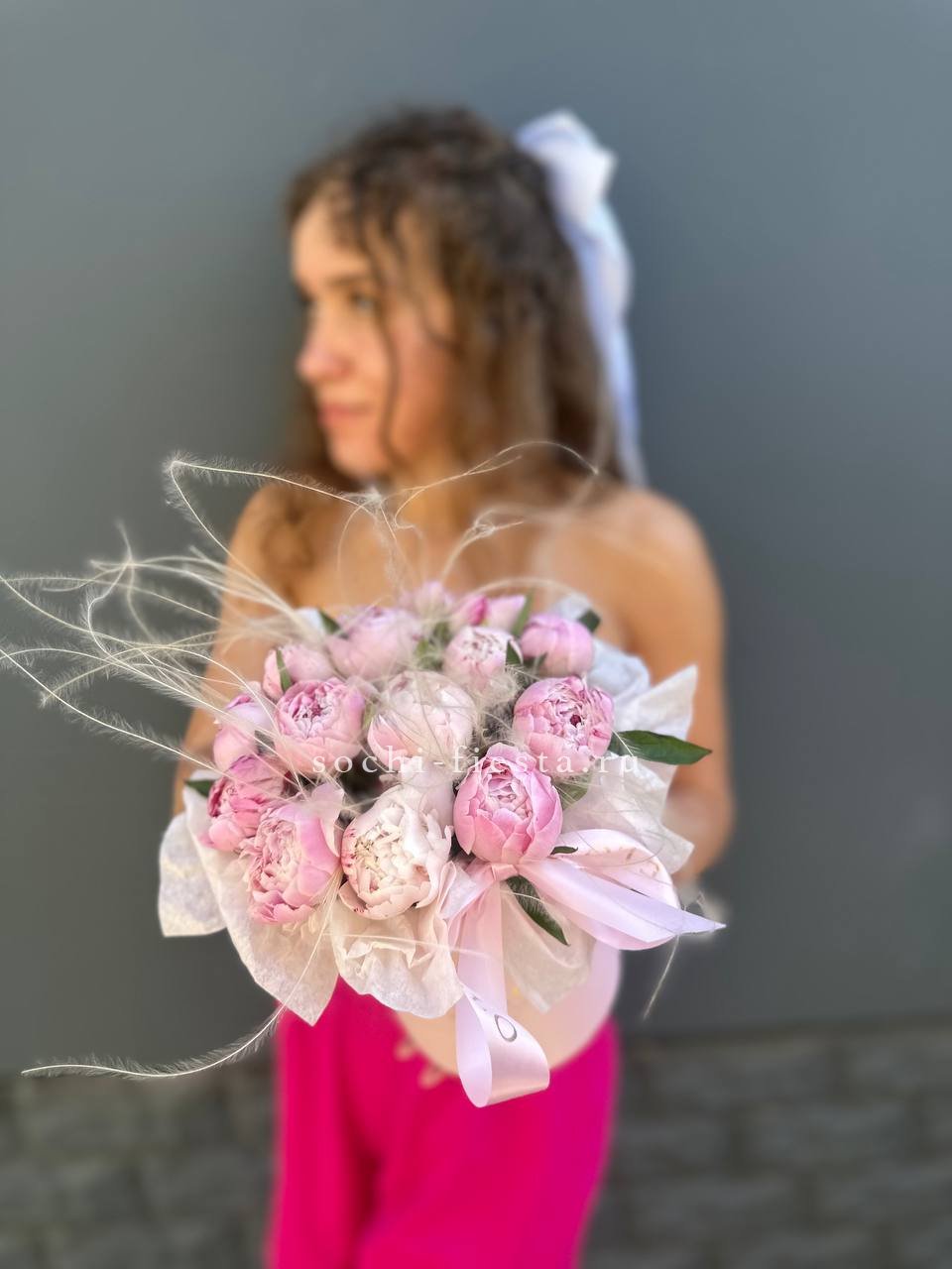 Пятнадцать пионов образуют пышную шапку над узким цилиндром. Стифа создает легкую дымку вокруг бутонов. Форма композиции позволяет разместить её даже на небольшой поверхности.