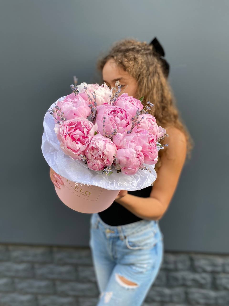 Девять пионов раскрываются над сиреневой дымкой лаванды. Цилиндр формирует вертикальную линию композиции. Фиолетовые оттенки переходят от насыщенных до припыленных.