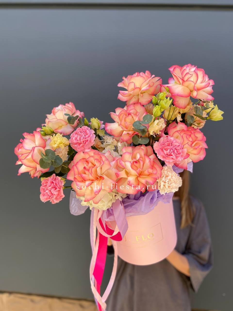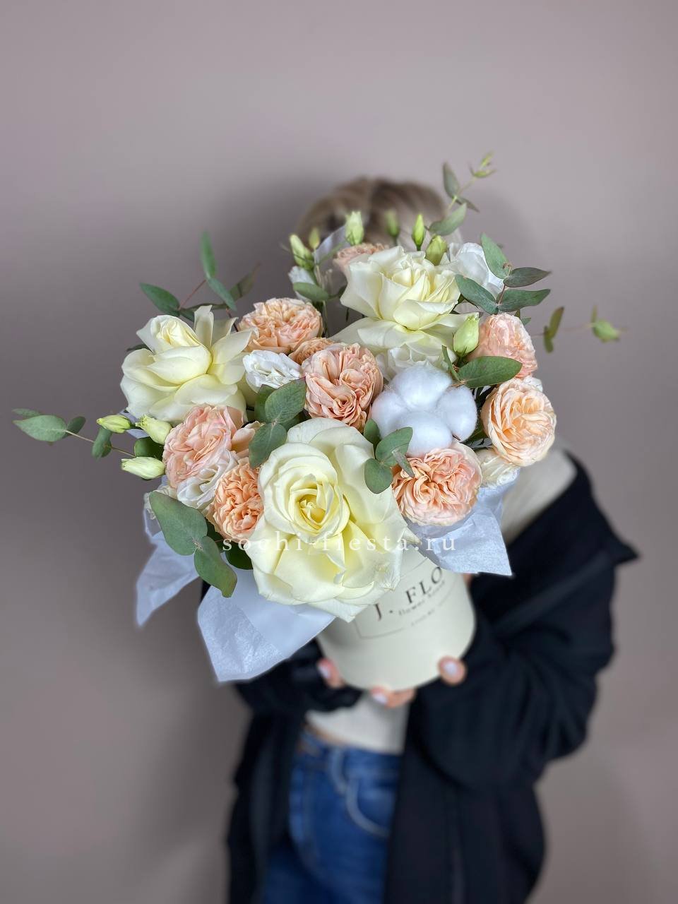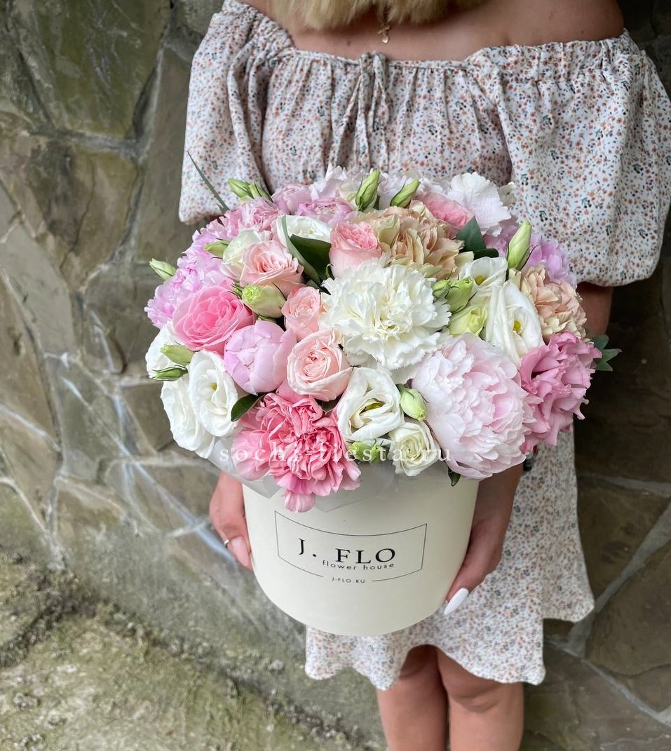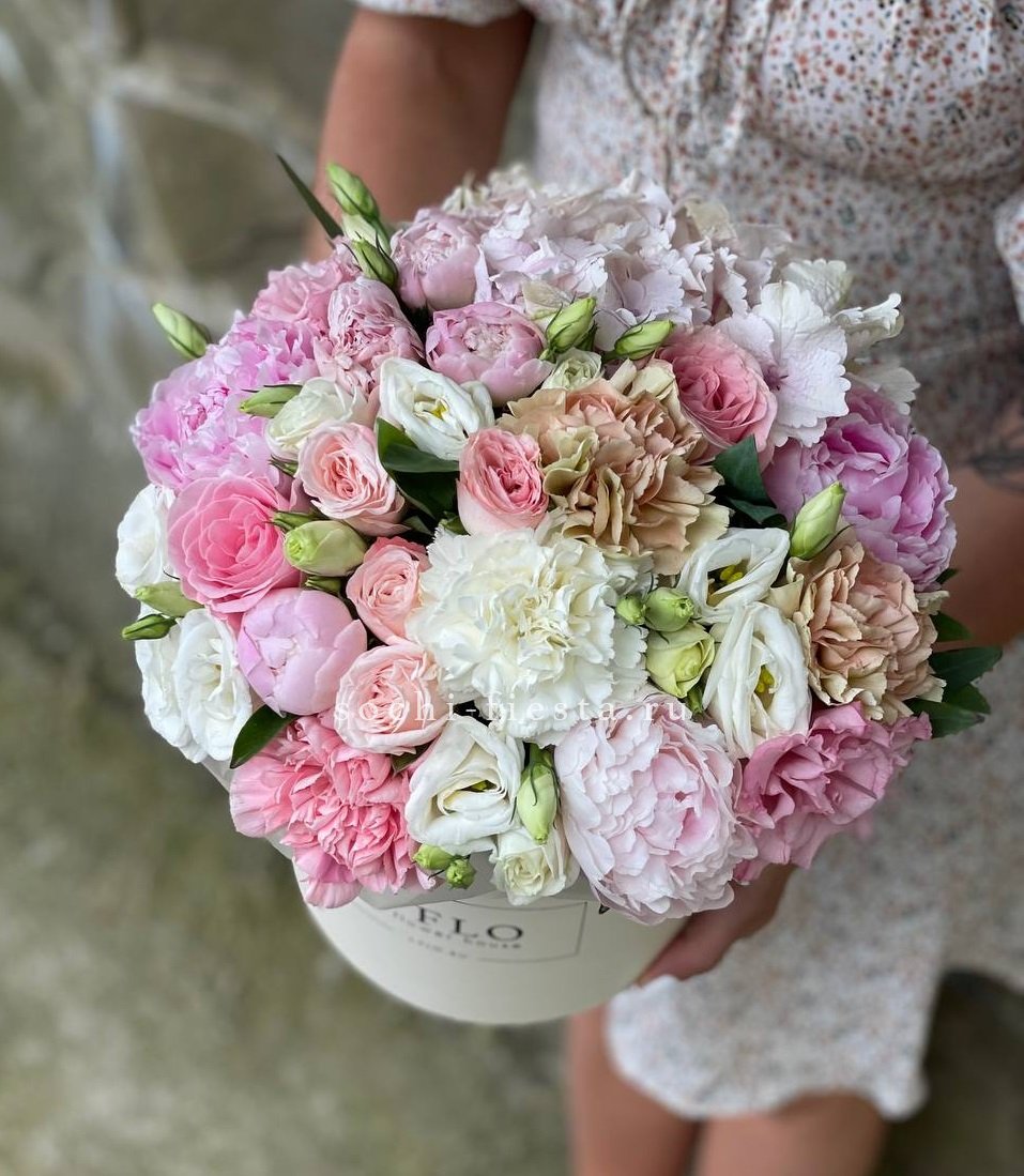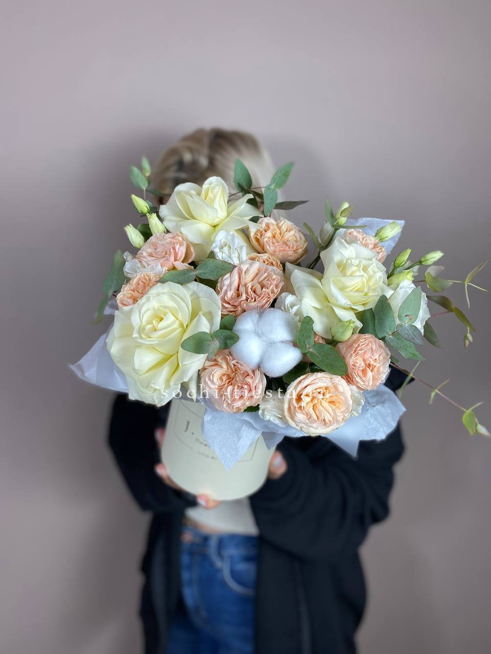 Воздушная композиция в пастельной гамме с акцентом на фактуру раскрытых бутонов. Пионовидные розы и эустома создают объёмный силуэт, а хлопок добавляет графичности.