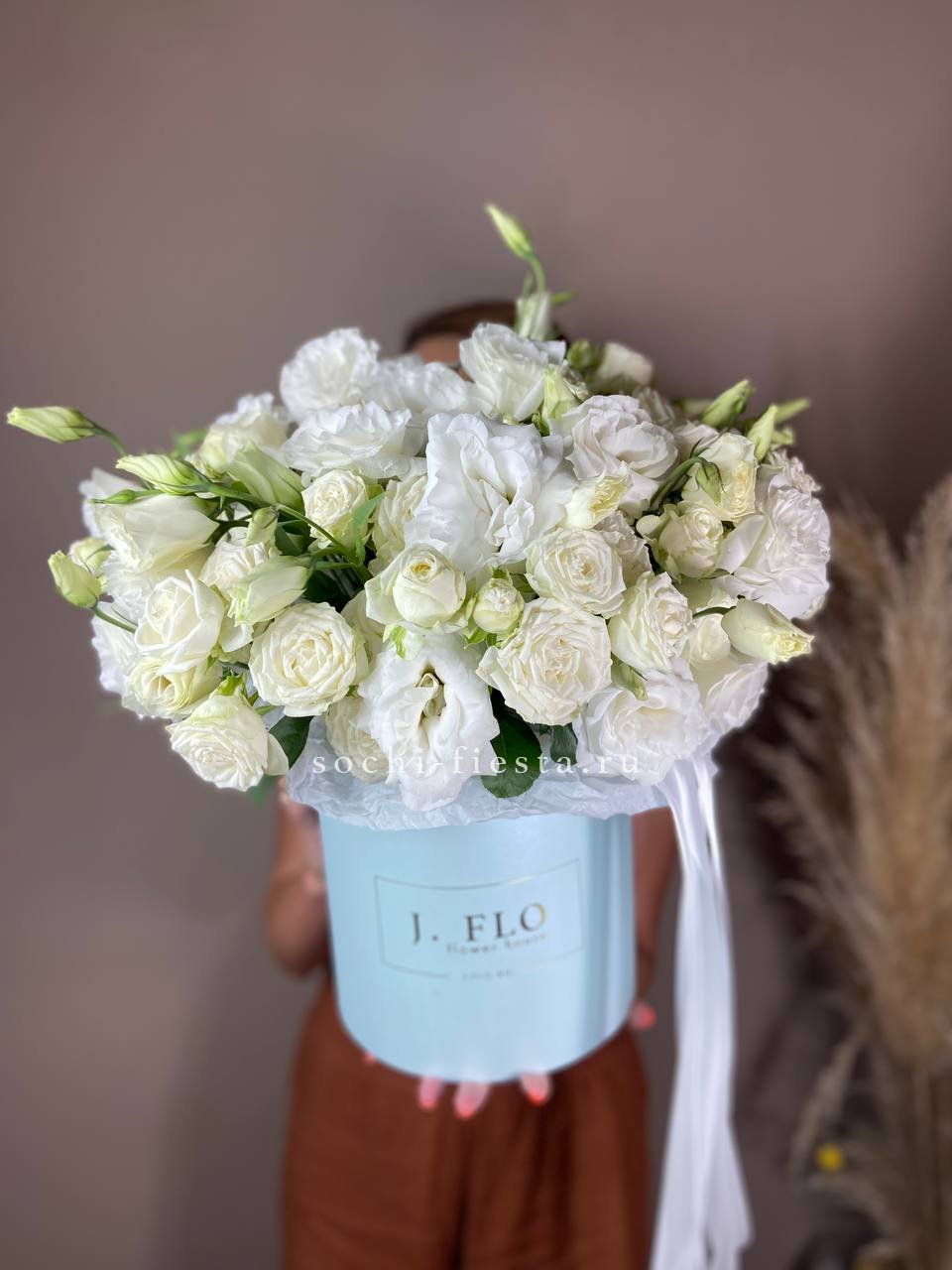 пионовидная кустовая роза бомбастик, эустома, лента, цилиндр D20.