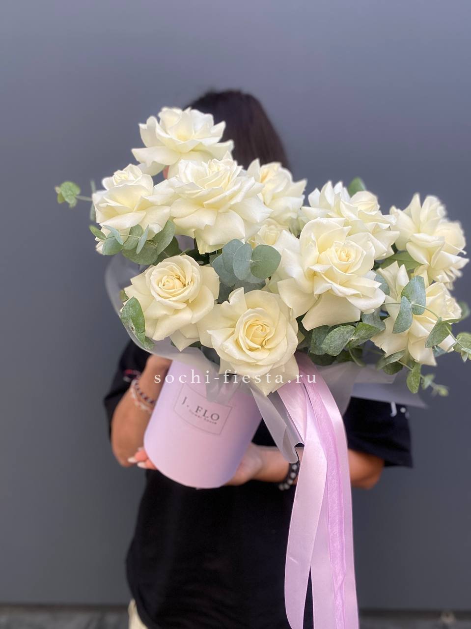 25 белых роз на фото, цилиндр D20.