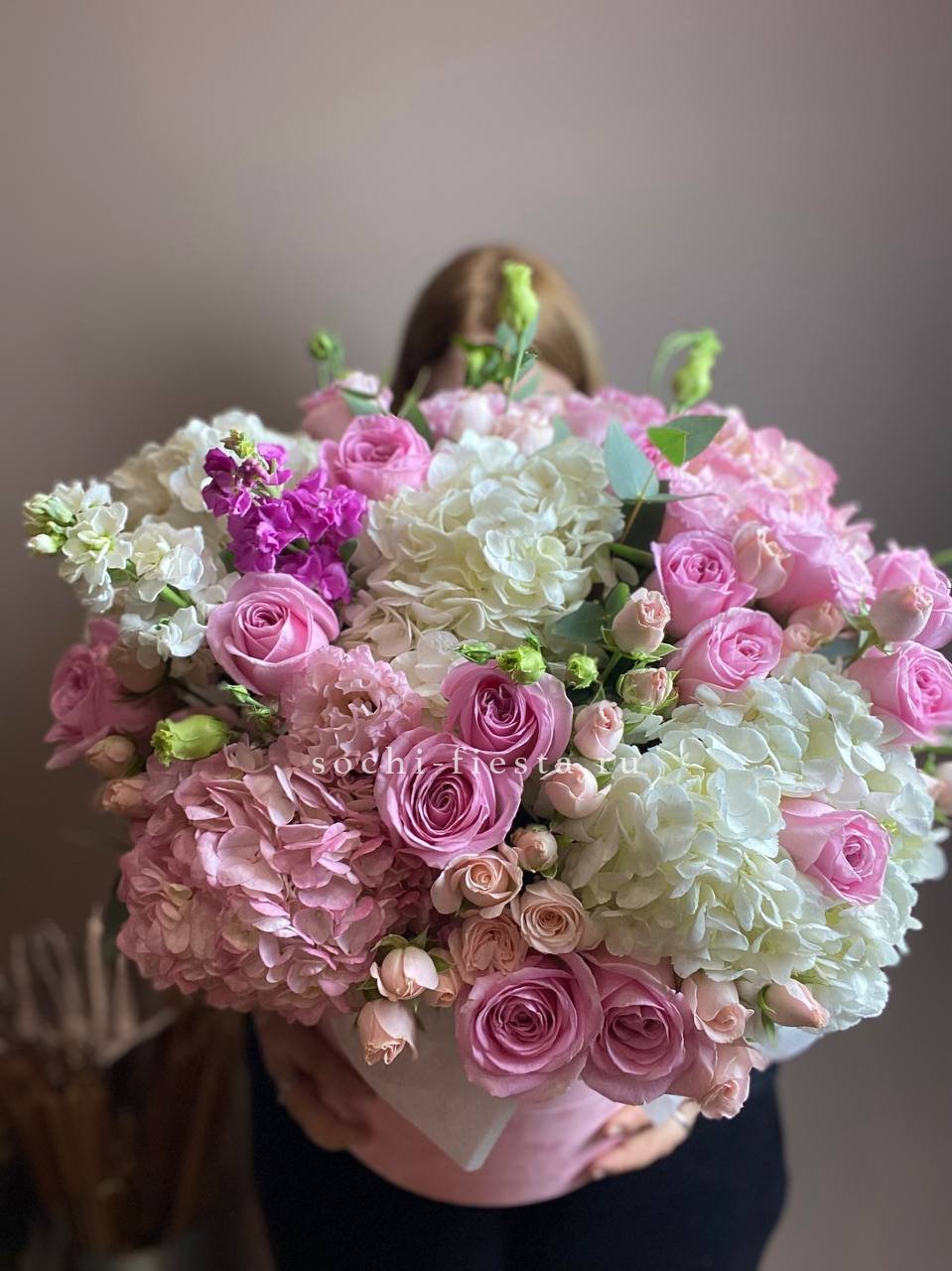 цветочная композиция в розово-белых тонах в розовом цилиндре D20-25.