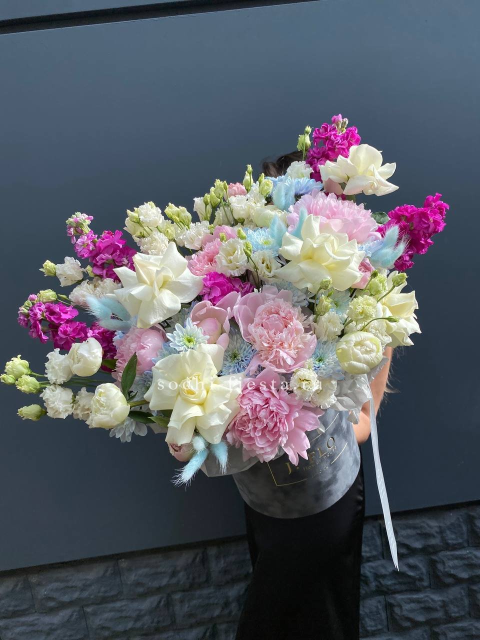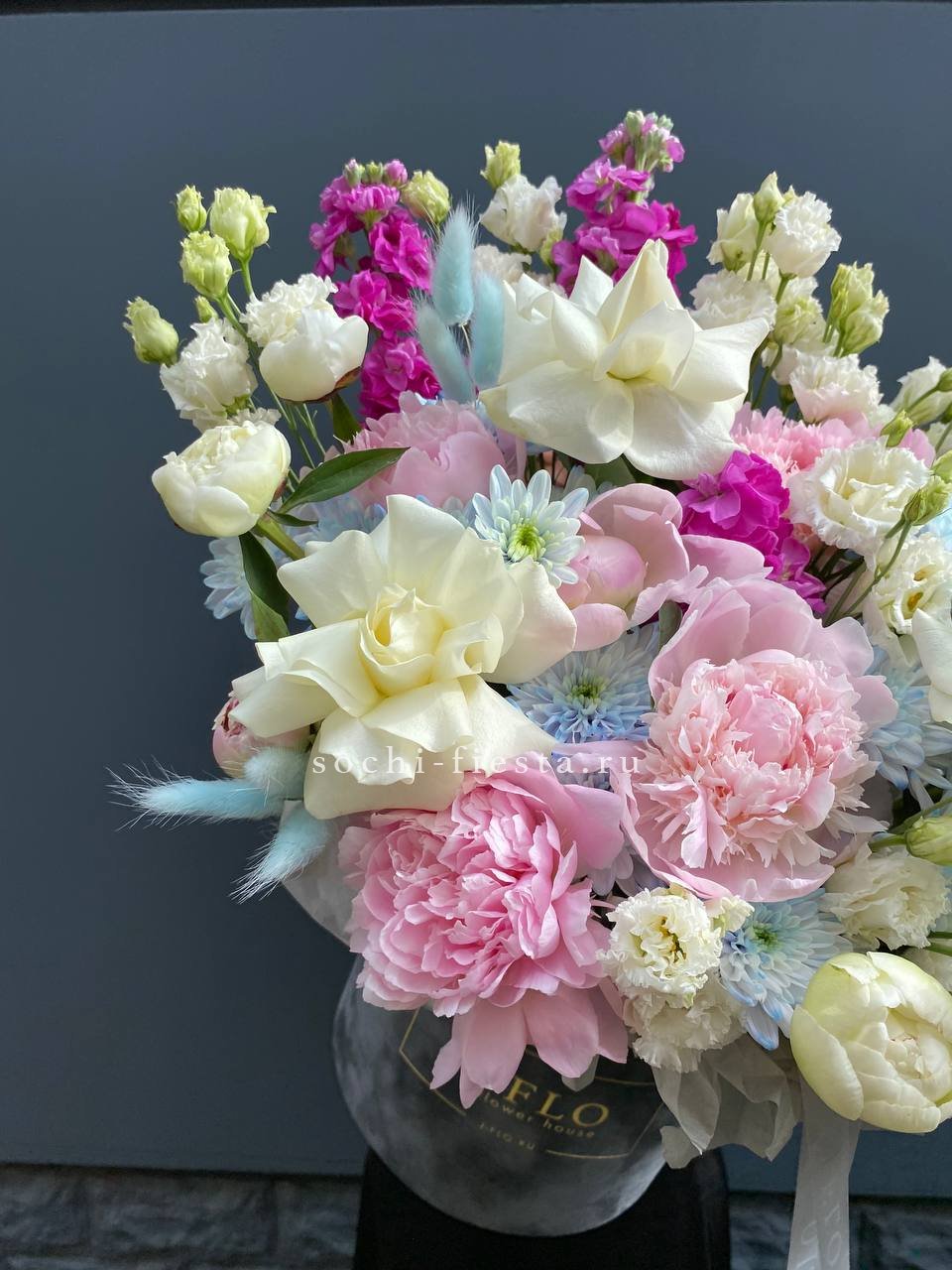 Белоснежные розы и эустома переплетаются с пушистыми соцветиями маттиолы и пионами в бархатном цилиндре. Лагурус добавляет воздушности, а весь образ создаёт ощущение летнего сада в доме.