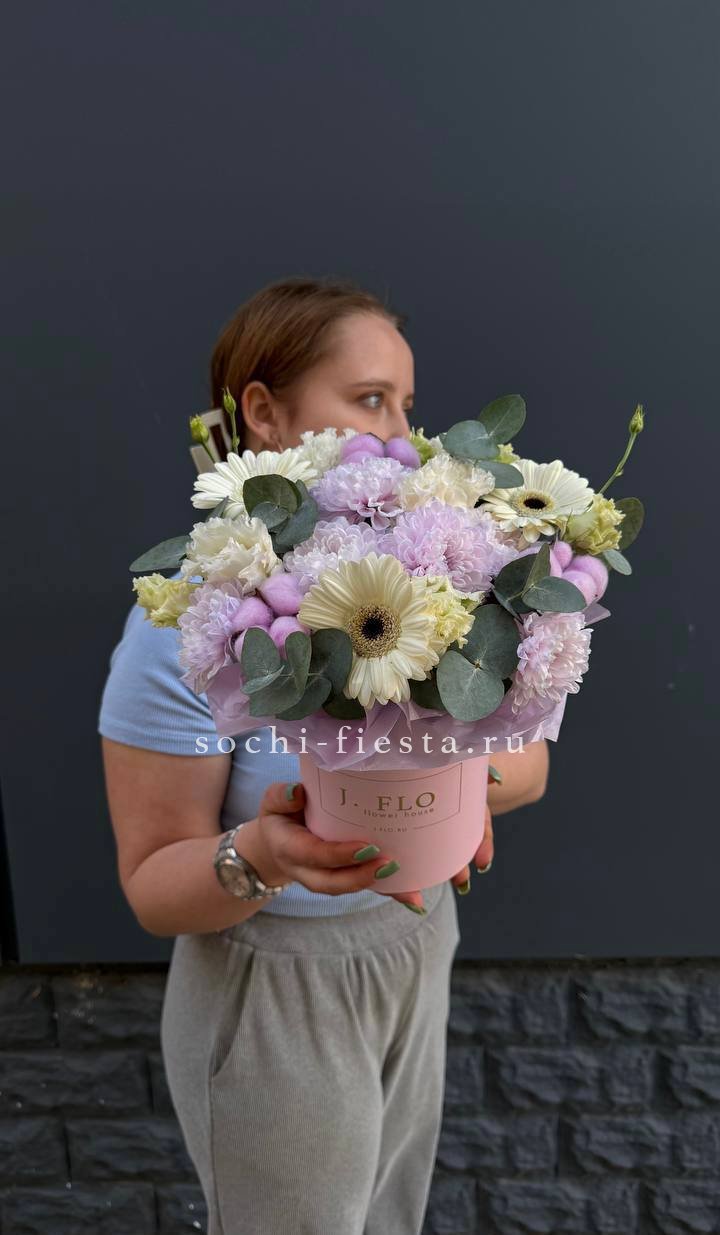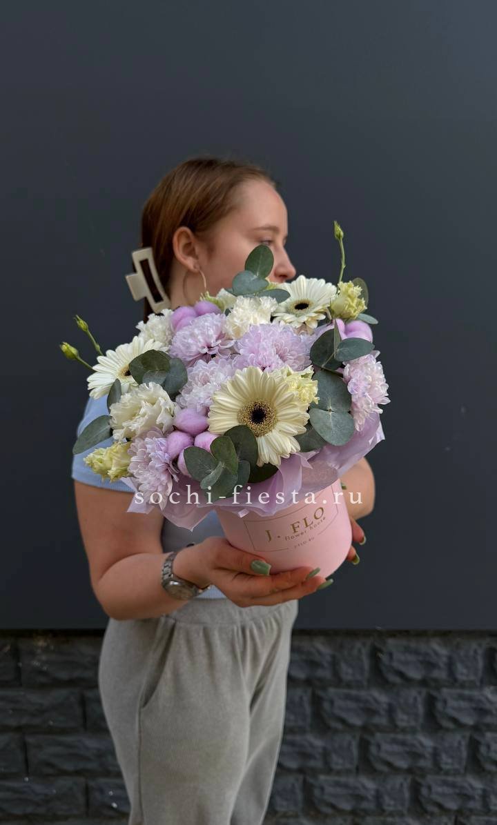 сборный нежный бокс из хризантемы, хлопка, герберы и эустомы.