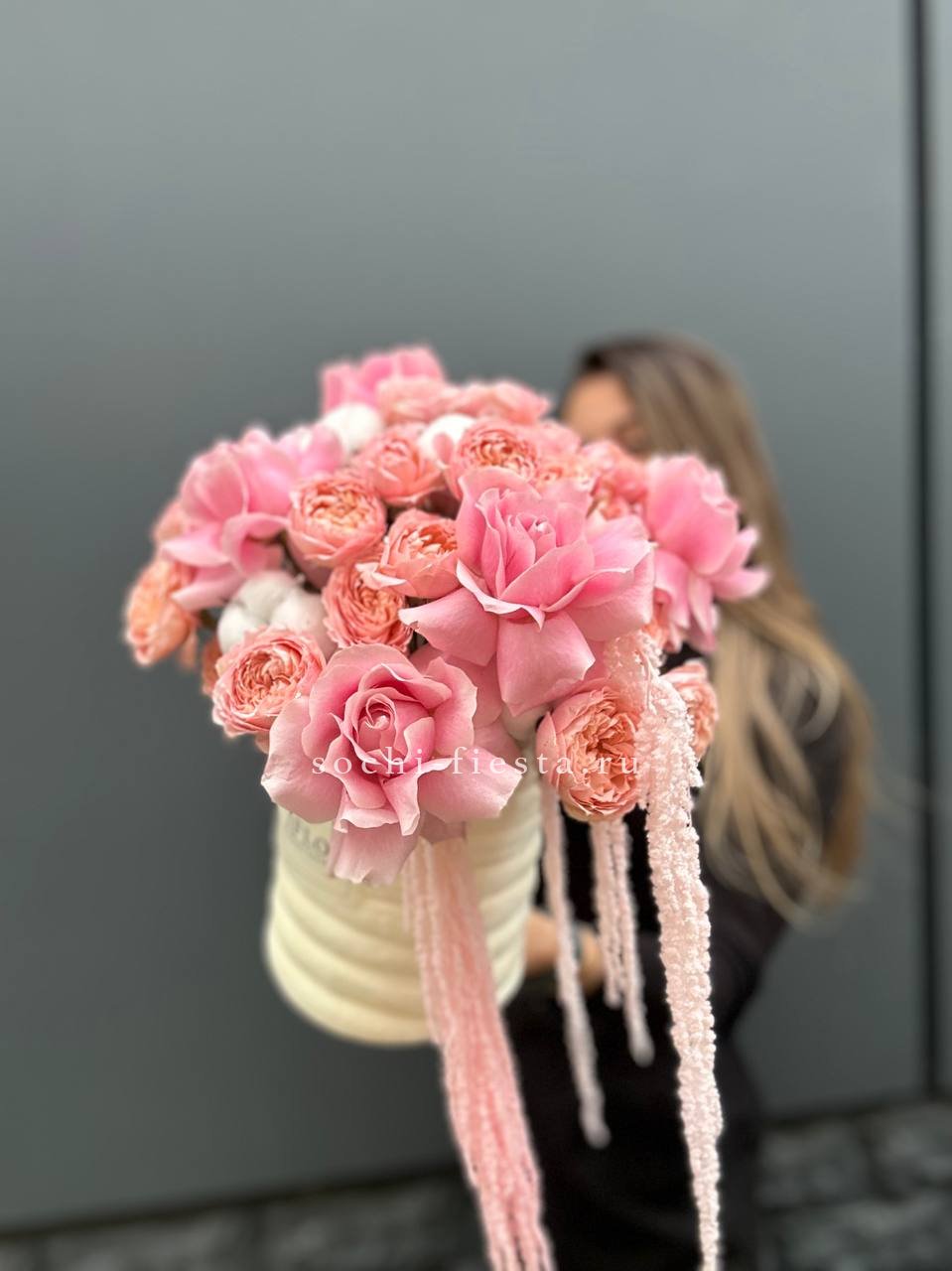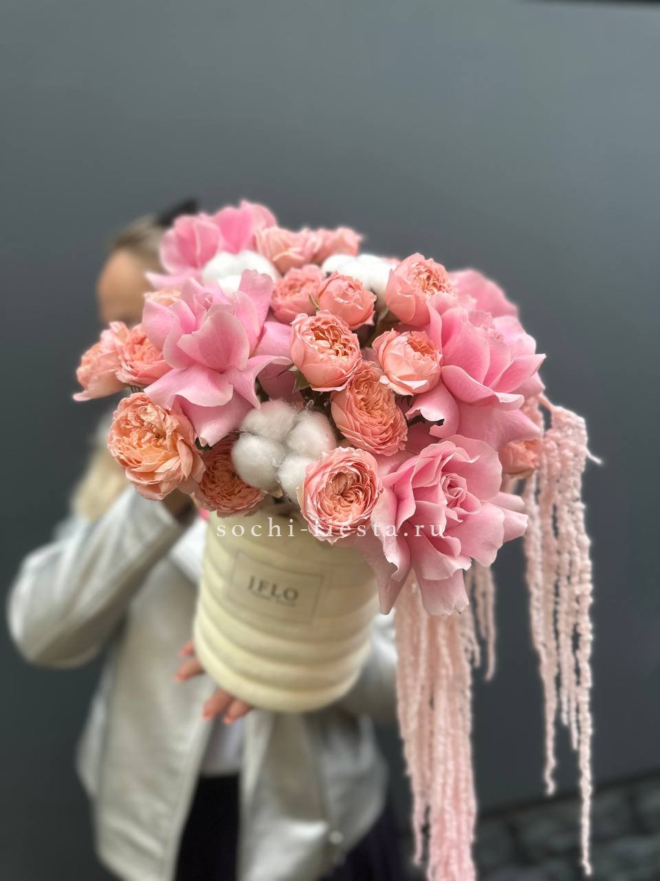 Розовая палитра переходит от французских роз к кустовым Джульетта с добавлением хлопка. Композиция в цилиндре сочетает воздушность и плотность фактур.