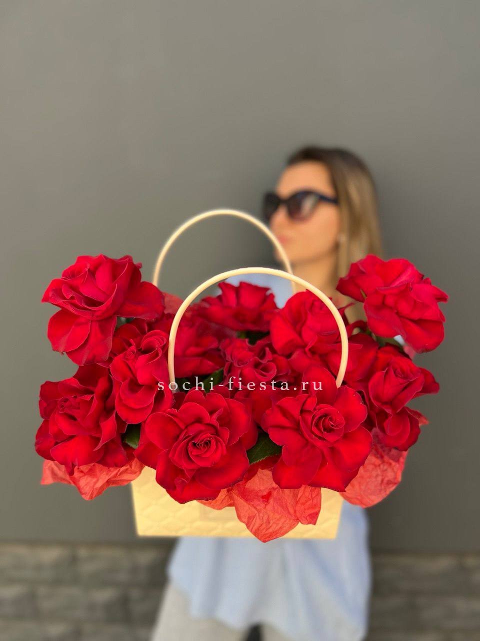 красные розы в сумочке.