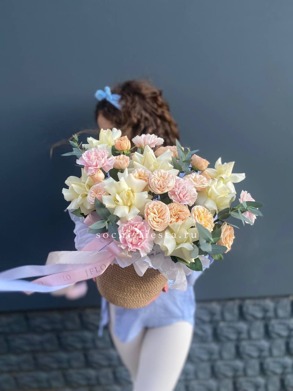 Мягкая палитра белых оттенков с вкраплениями диантуса создает воздушную композицию в натуральном джутовом кашпо. Кустовые розы добавляют объем, а эвкалипт завершает природную гармонию. Готовое решение для интерьера в спокойных тонах.