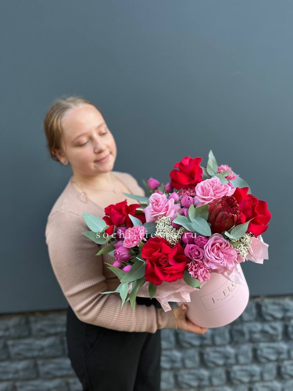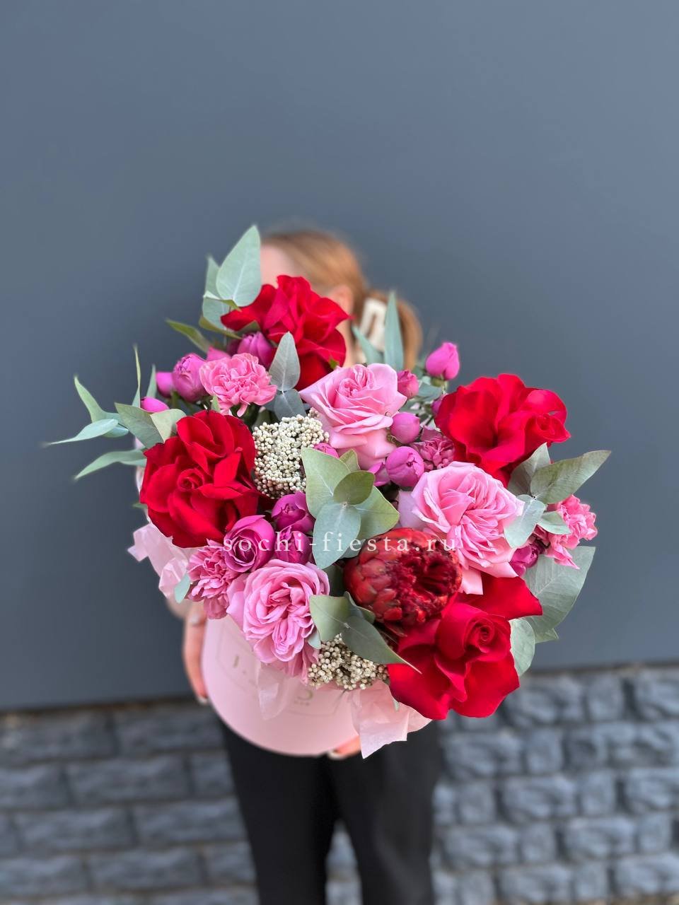 Экзотичная протея задаёт тон всей композиции, где розовые и красные розы переплетаются с фактурным озатамусом. Диантус добавляет графичности, а эвкалипт смягчает линии.