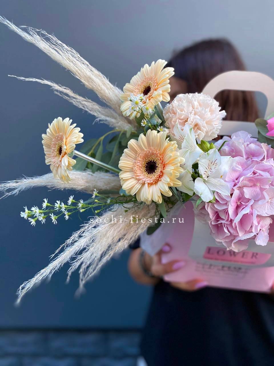 Голубая гортензия задает тон всей композиции, а яркие герберы и диантусы добавляют живости. Компактная форма в сумочке удобна для вручения и не требует вазы.