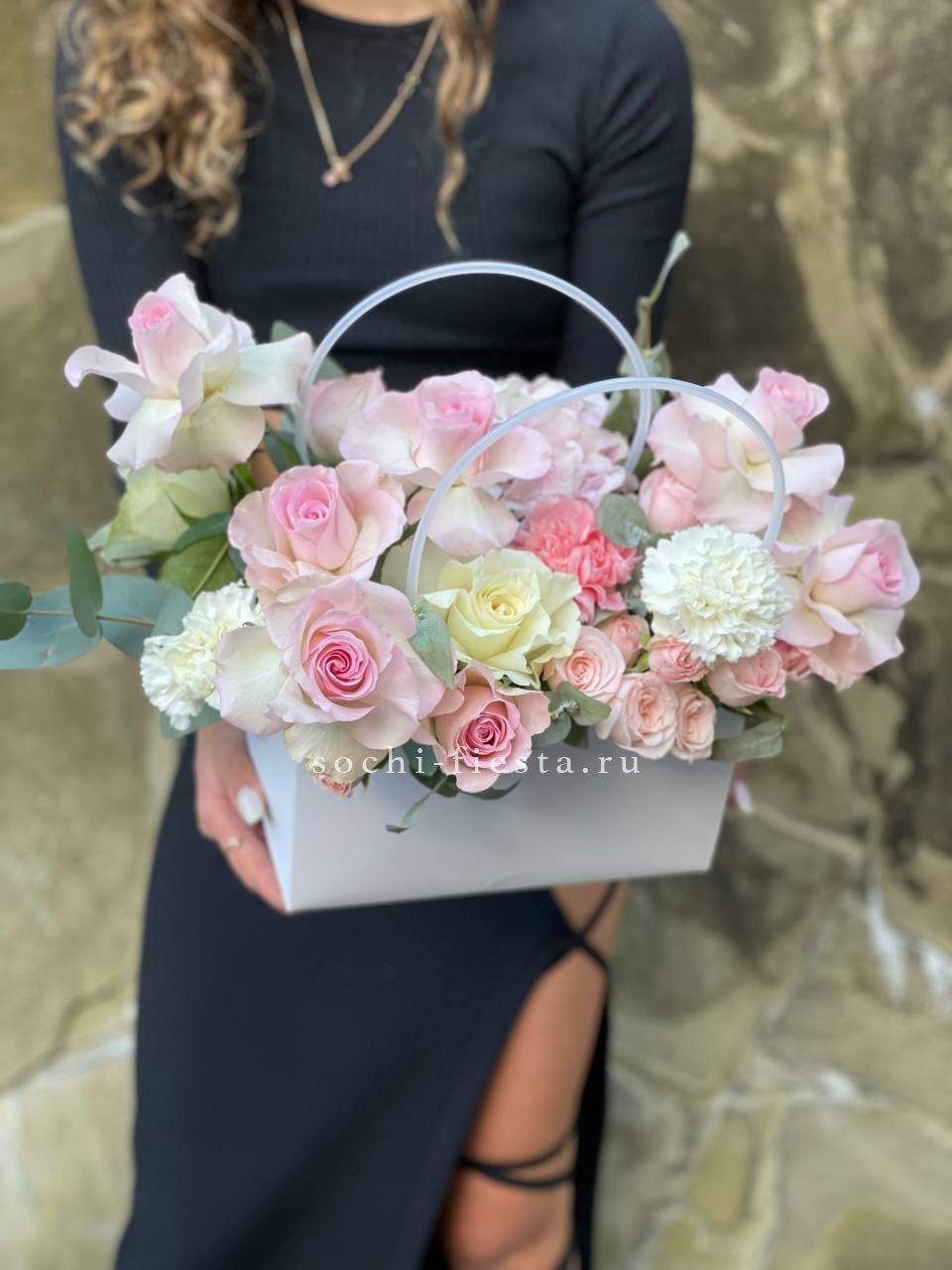 эустома, французские розы, эвкалипт, лилия, сумочка, оазис.