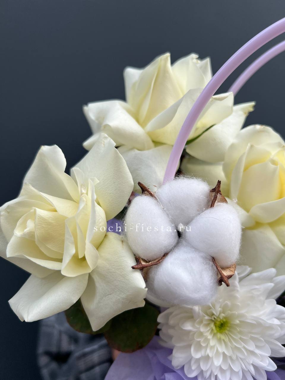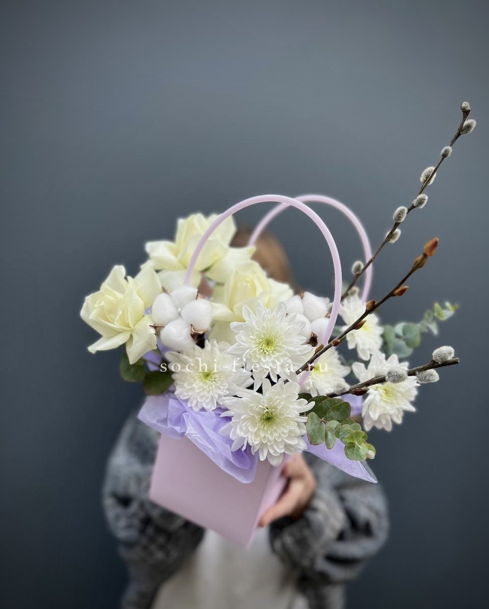 Белые розы и хризантемы сочетаются с воздушной эустомой и хлопком в сумочке. Светлая гамма с прохладным оттенком напоминает морскую свежесть и создает спокойное настроение.