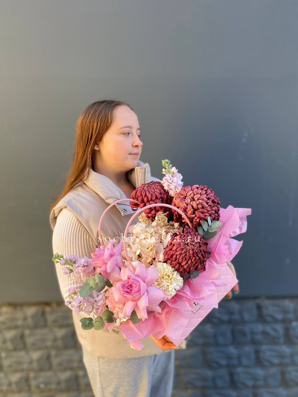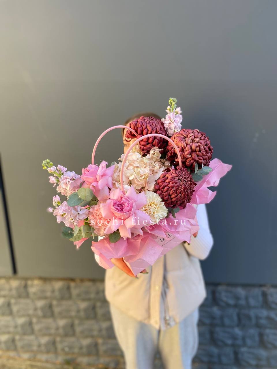 Композиция в сумочке собрана из розовых роз, гортензии и маттиолы с добавлением декоративных бигуди. Мягкая палитра и необычные детали создают легкое романтичное впечатление.