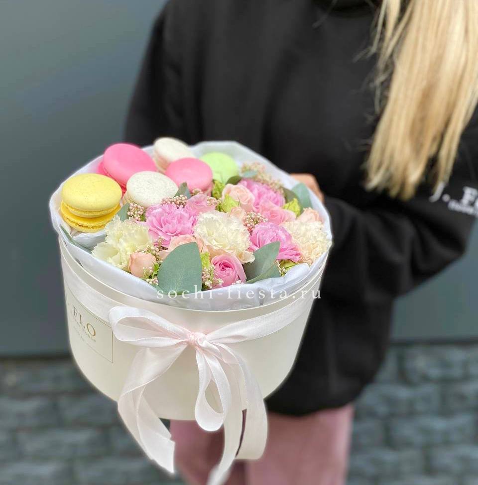 эустома, розы, кустовые розы, диантусы, эустома, озотамнус, макаронс- 6 шт., коробка. Данная цена доступна при заказе от 10 шт.