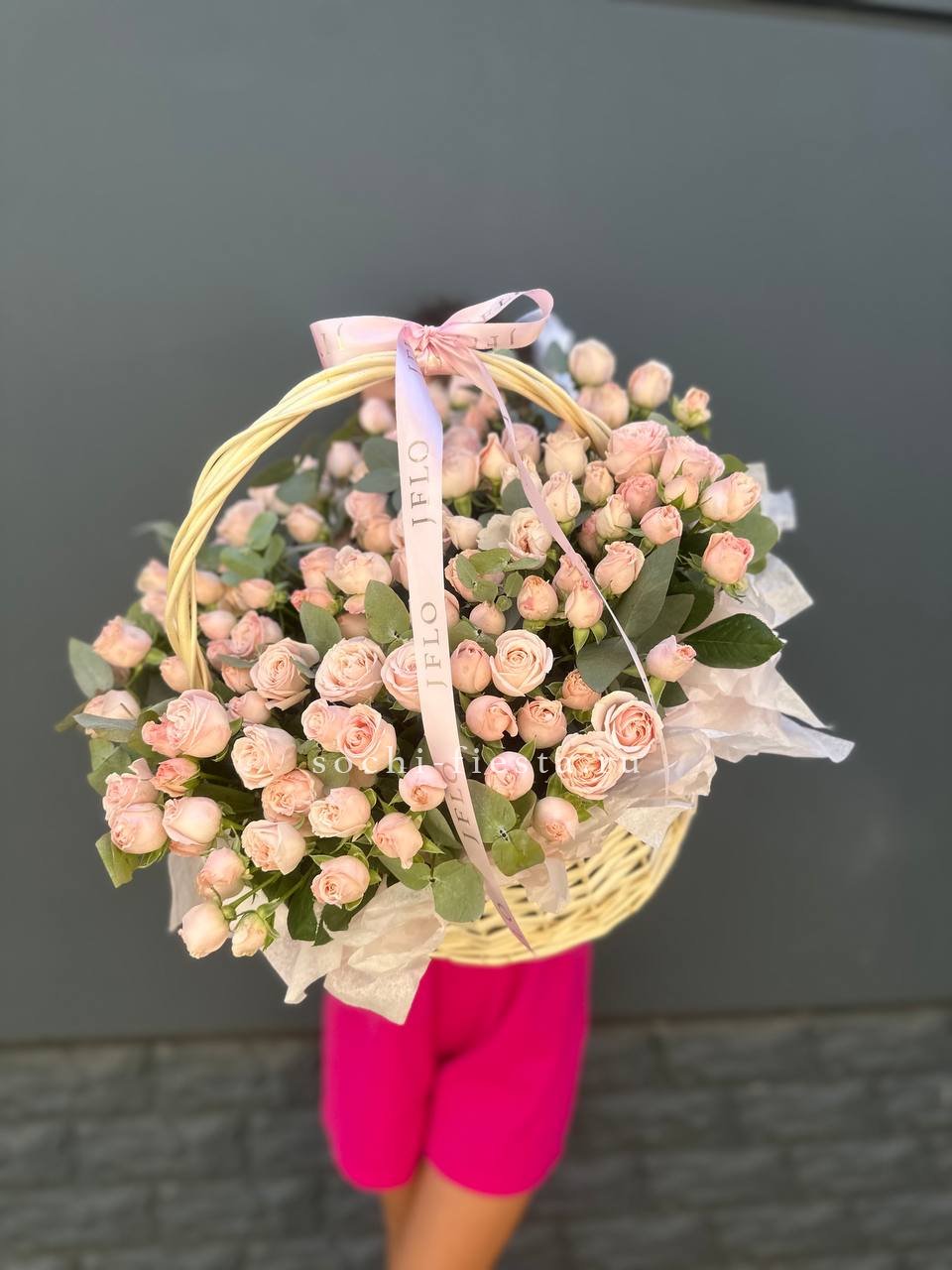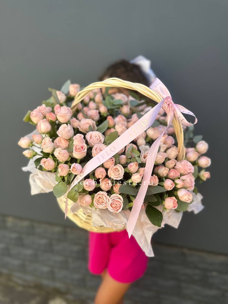 555 роз, зелень (папоротник или эвкалипт, в зависимости от сезона) оформление в корзину. Длина надписи не должна превышать 4 букв.