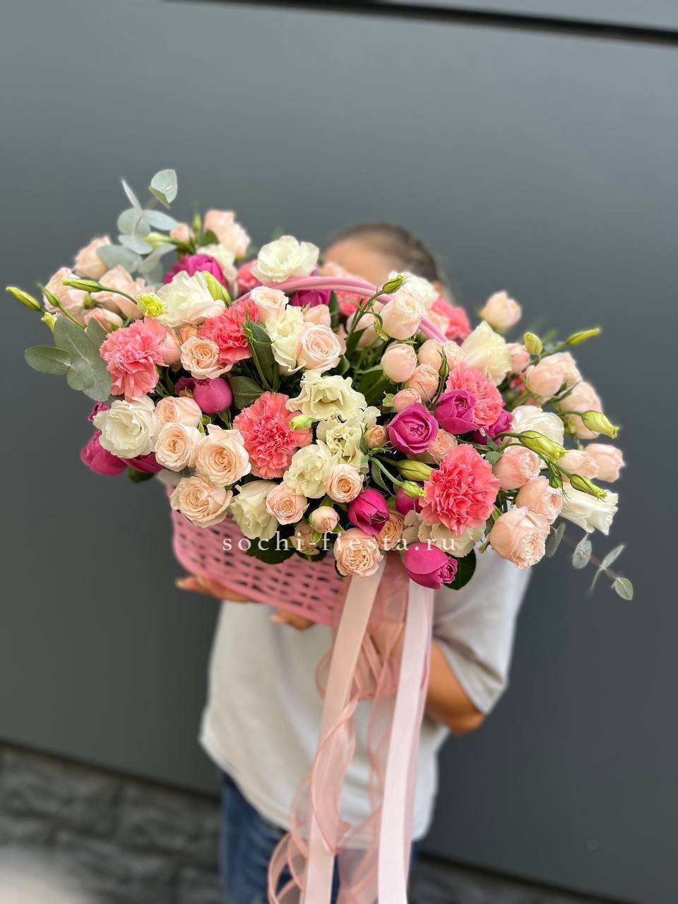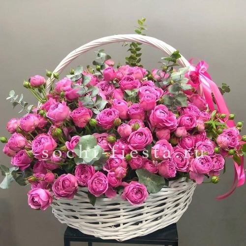 Пышная корзина с кустовыми розами и эустомой создает ощущение летнего изобилия. Диантусы добавляют воздушности между крупными бутонами, формируя объемную композицию. Готовое решение для яркого поздравления в удобной форме.