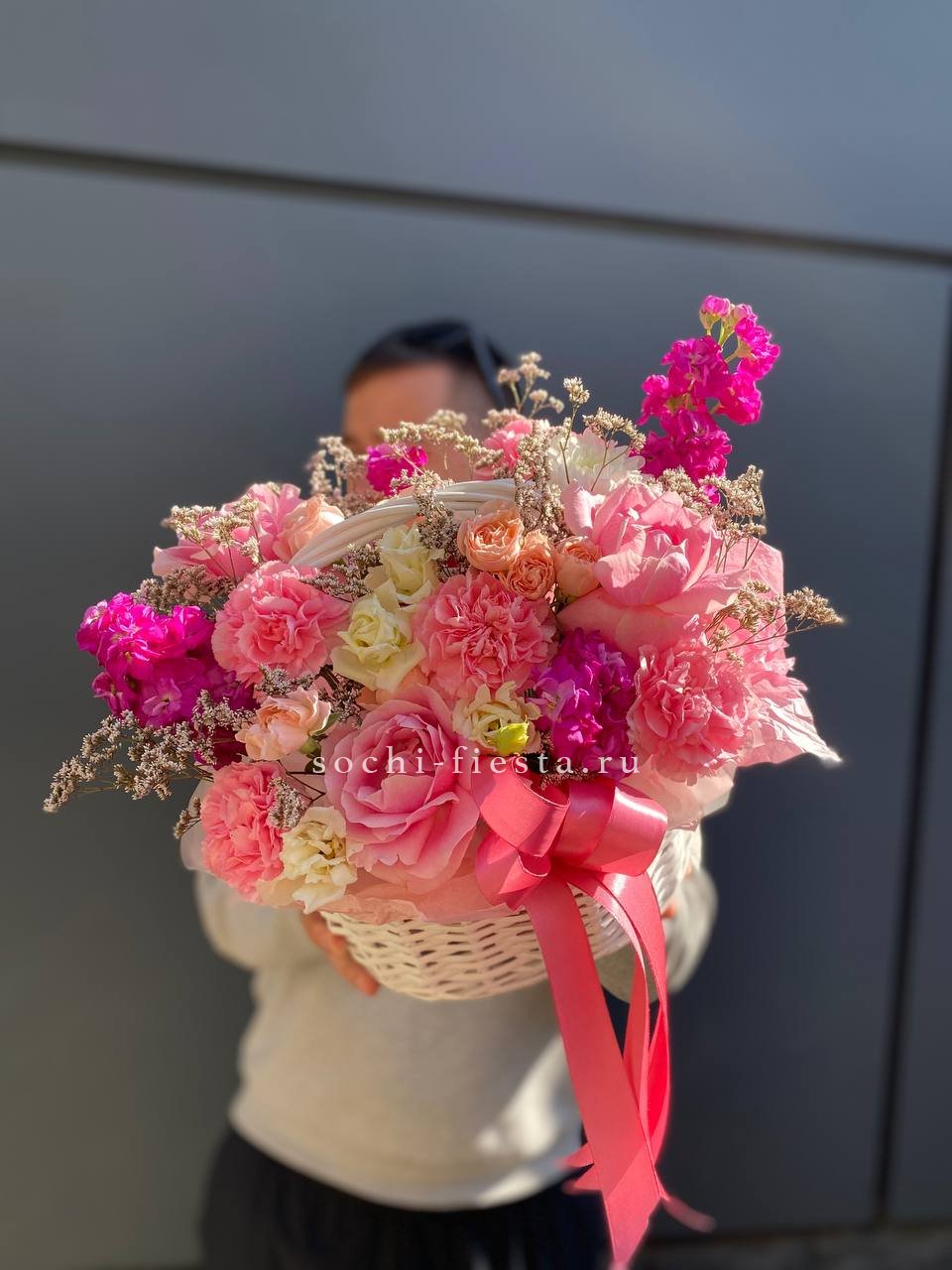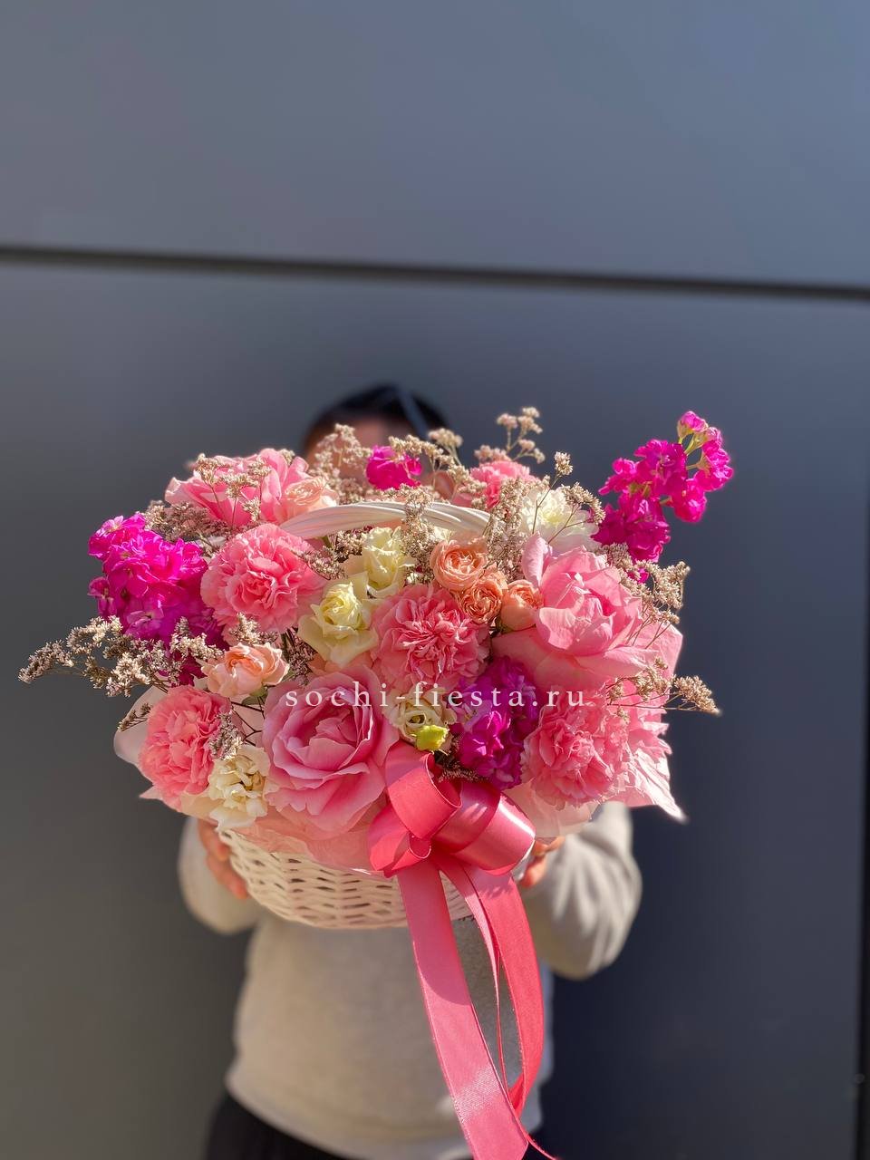 маттиола, гортензии, кустовые розы, розовые розы в корзине.