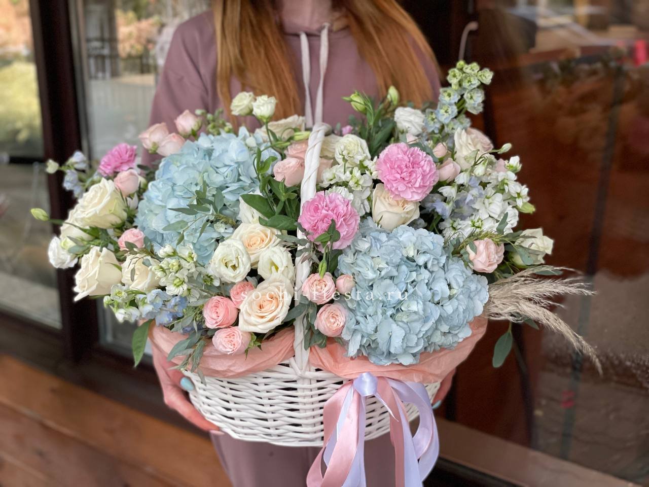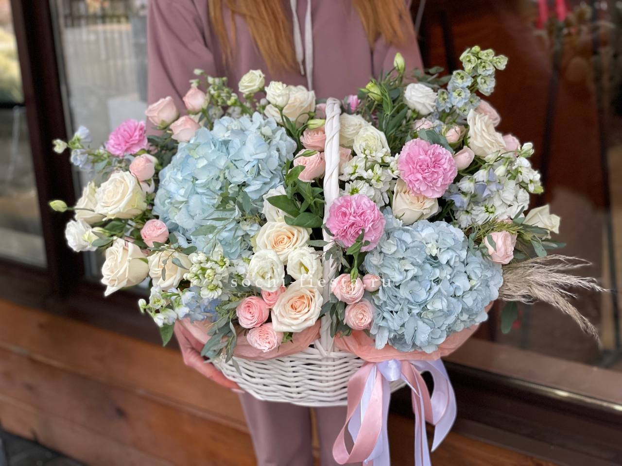 Пышная корзина с розами и гортензиями собрана плотно и объёмно. Маттиола добавляет живую текстуру между крупными соцветиями, а кустовые розы заполняют композицию мягкими переходами. Результат — впечатляющее присутствие, которое меняет восприятие пространства.