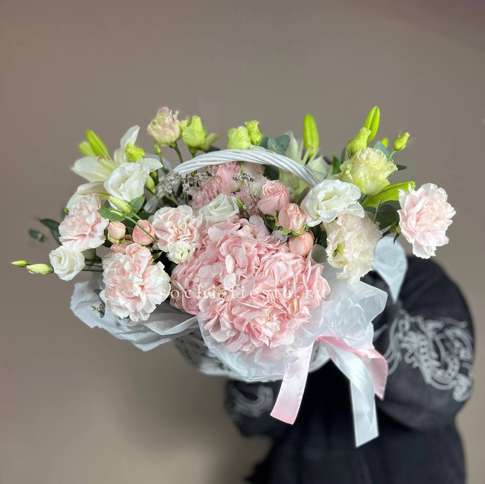 голландский пион Сара Бернар - 555 шт.,лента, светлая корзина D40.