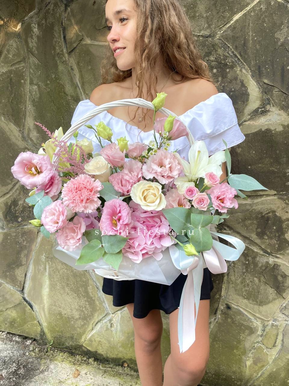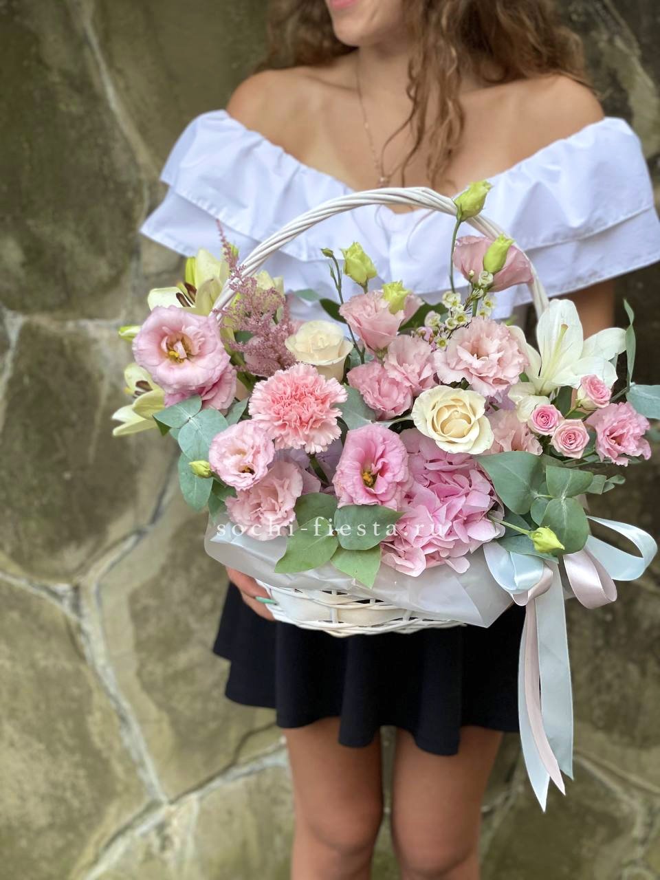 Белые розы и эустома образуют воздушную композицию с мягкими переходами между соцветиями. Хризантемы и маттиола добавляют объема, а гипсофила создает легкую дымку по краям. Корзина выглядит свежо и собранно в любом пространстве.