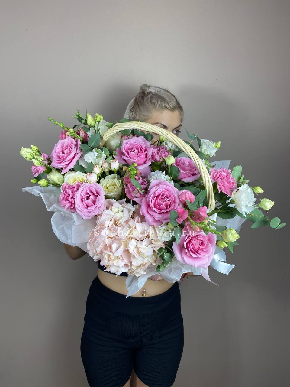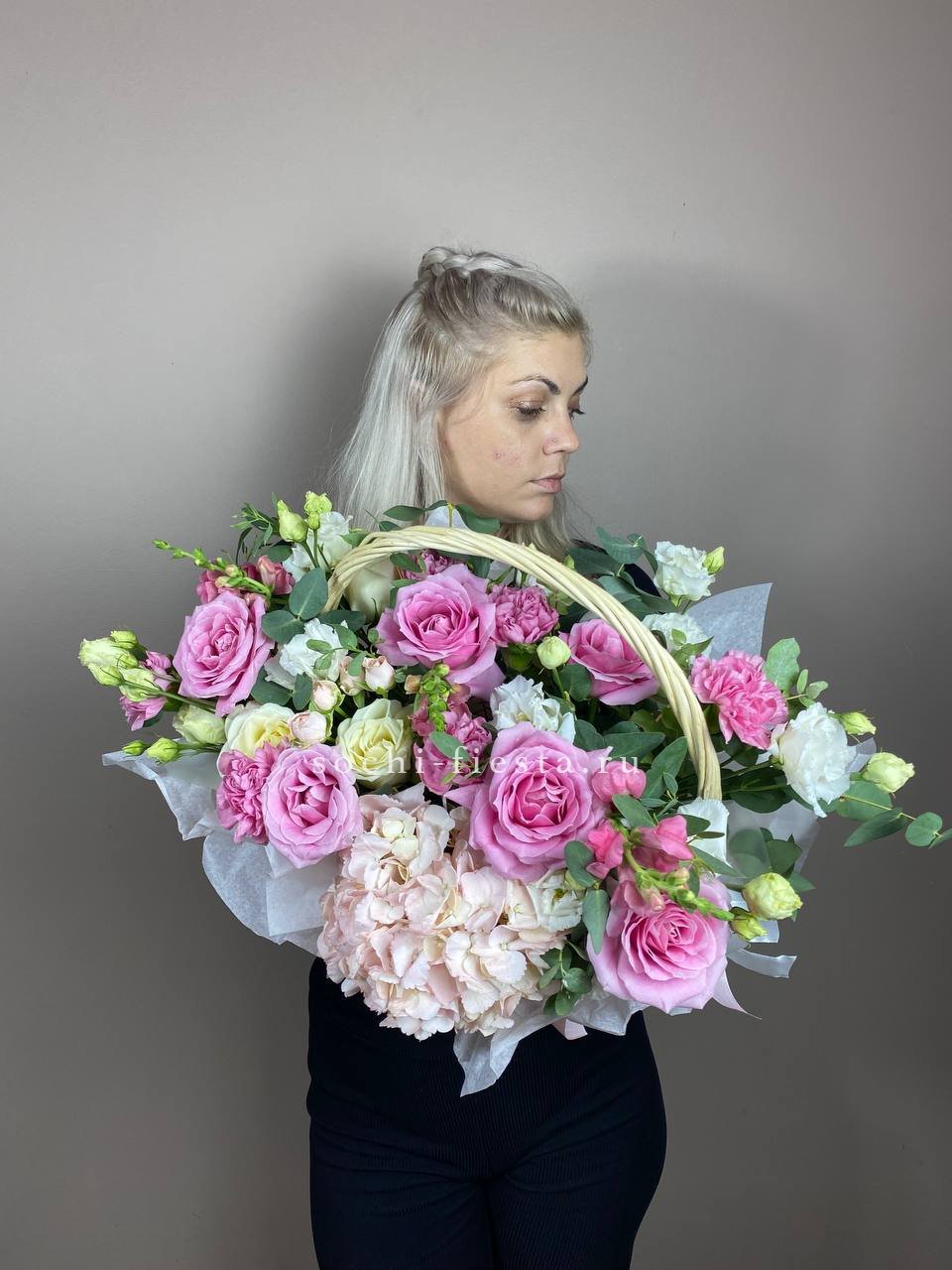 Плотная россыпь кустовых роз и эустомы создает живую текстуру с множеством мелких бутонов. Диантус добавляет воздушности, а эвкалипт собирает композицию в завершенную форму. Корзина позволяет разместить букет на столе без дополнительной вазы.