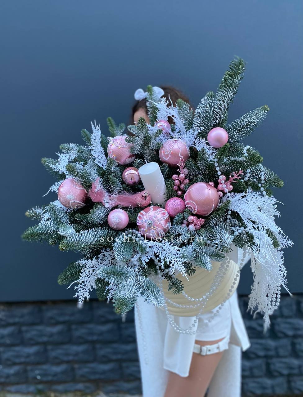 Высокая композиция с двумя свечами и обилием нобилиса создаёт торжественную вертикаль. Глубокий зелёный цвет хвои оттеняет блеск игрушек и мерцание огня в центре.