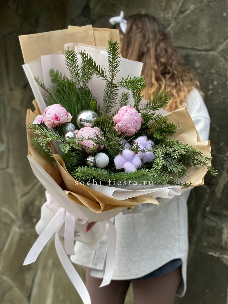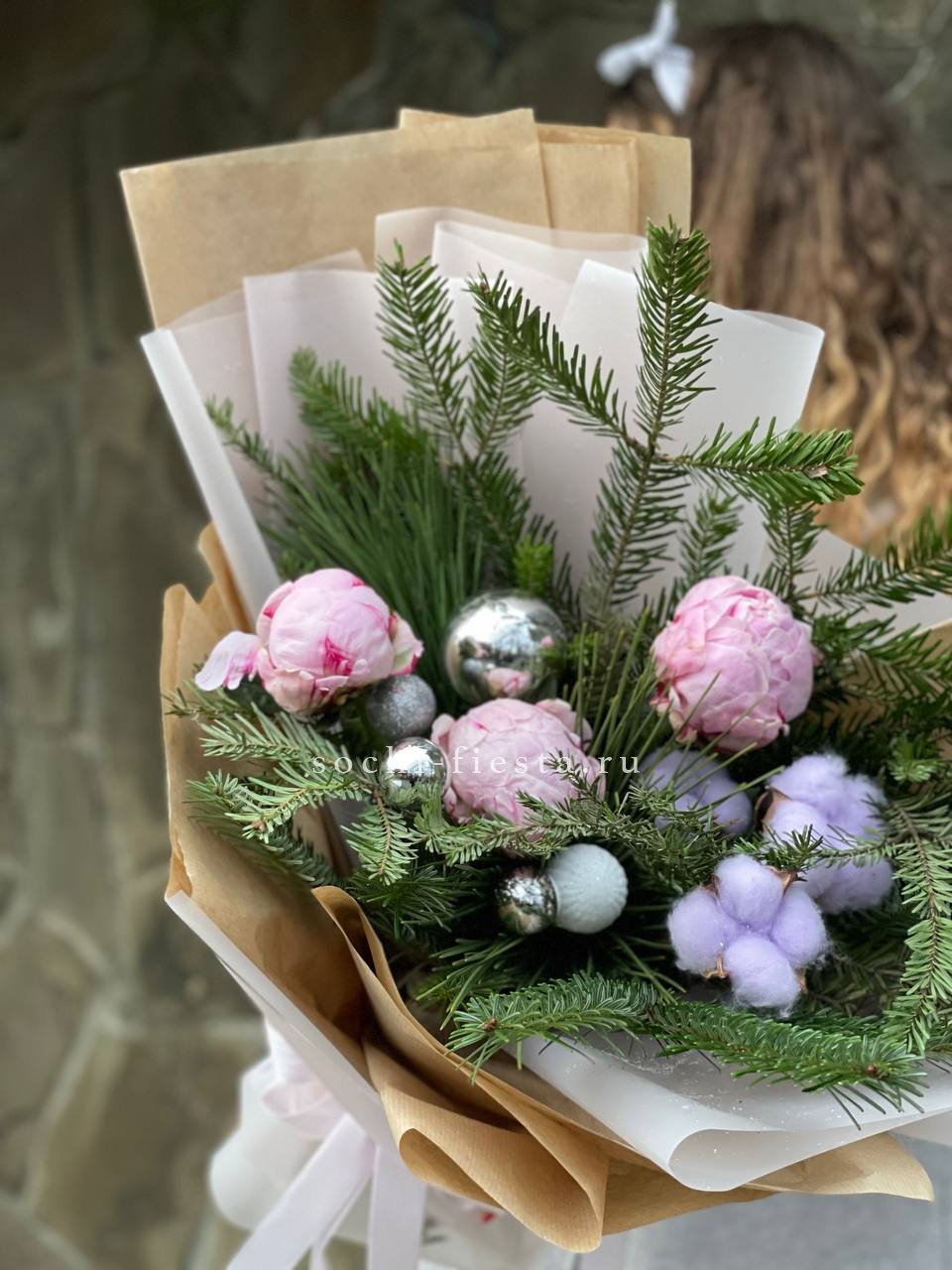 Три пиона среди датского нобилиса создают неожиданное сочетание зимней свежести и летней памяти. Хлопок и украшения завершают композицию, которая дарит ощущение праздника вне сезона.