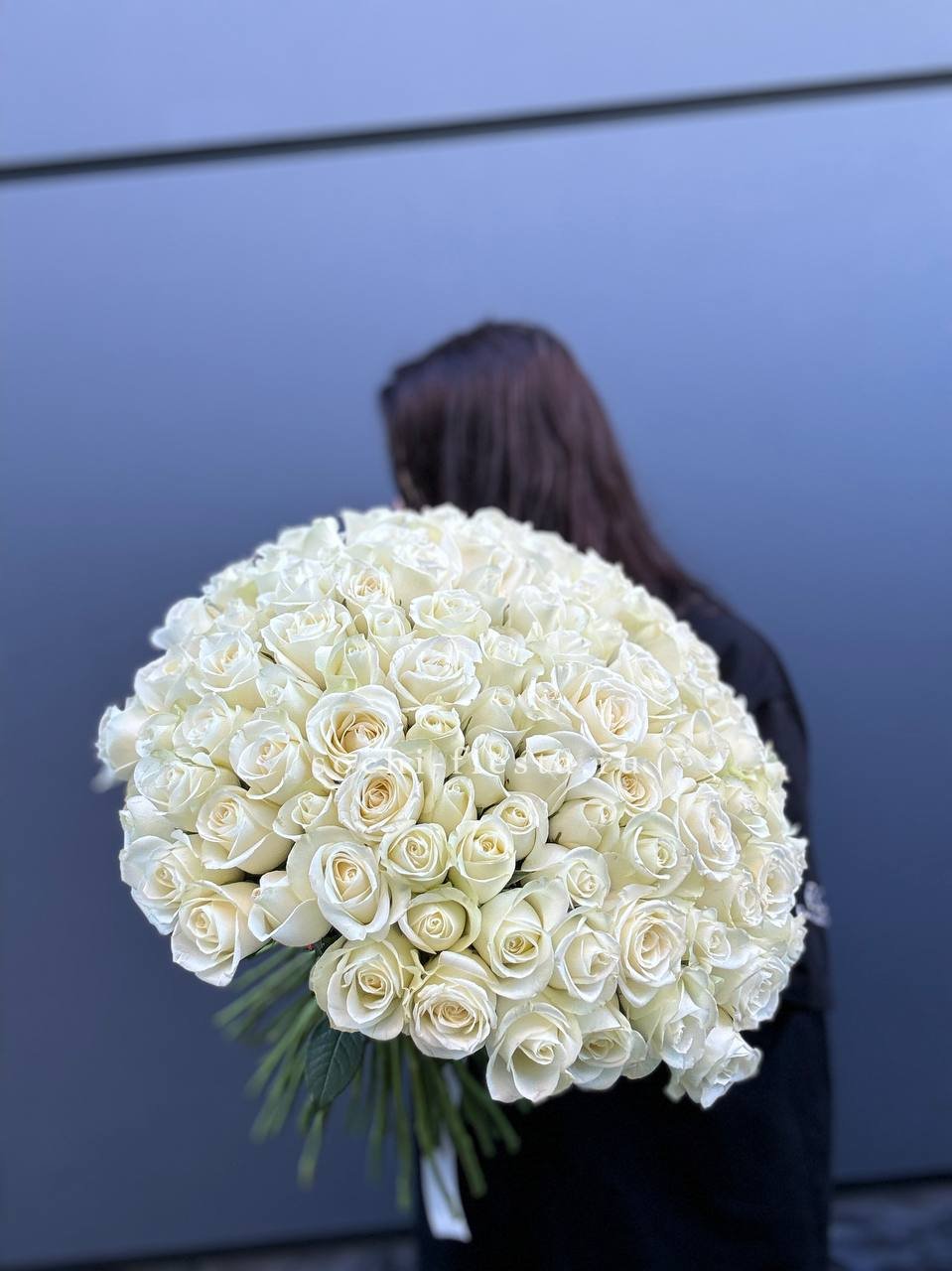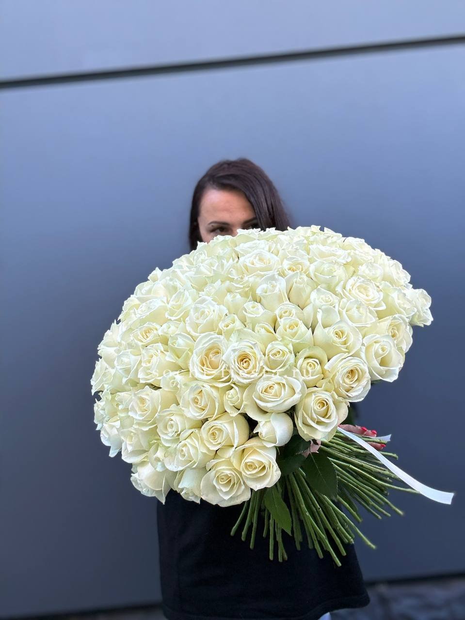 Охапка из ста одной розы – это про масштаб и драматичность момента. Белоснежные бутоны плотно собраны вместе, создавая монументальную форму. Композиция говорит сама за себя без лишних деталей.