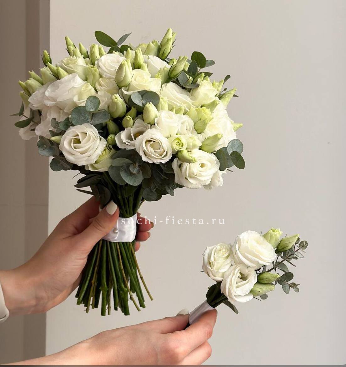 Кремовые и белые оттенки перетекают друг в друга, создавая мягкий переход без резких границ. Эвкалипт и дизайнерская упаковка завершают образ.