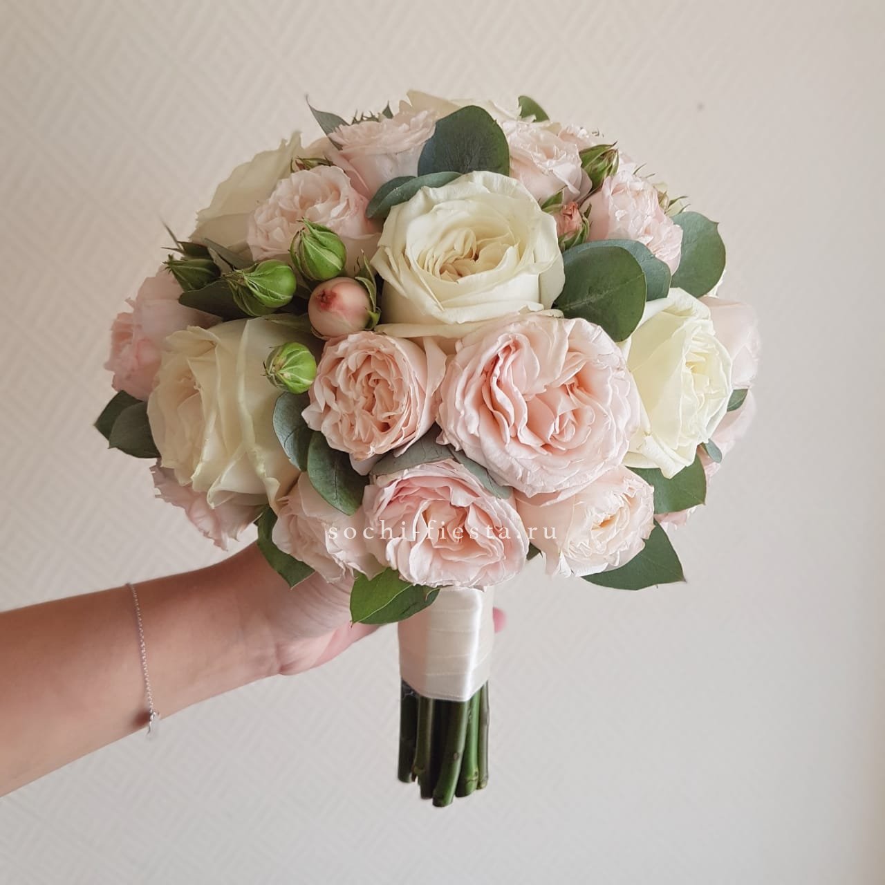 Девятнадцать бутонов эустомы раскрываются слоями воздушных лепестков создавая мягкую текстурную глубину. Эвкалипт добавляет свежести этому монохромному свадебному решению.