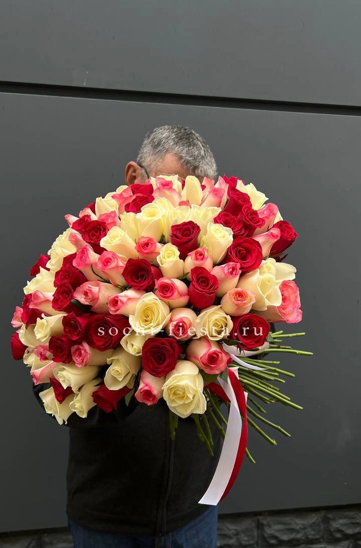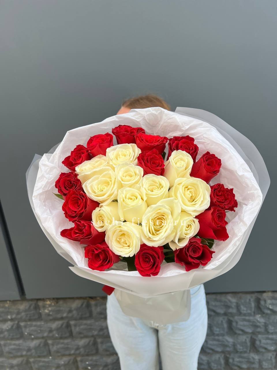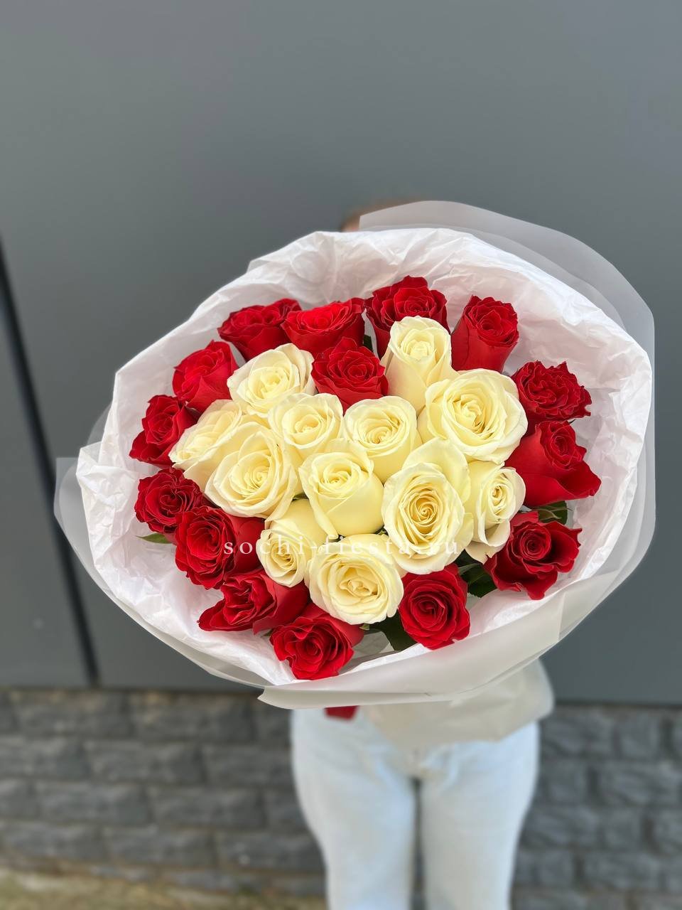 Красные и белые розы чередуются в крупной композиции, создавая живую игру света и тени между бутонами. Контрастная палитра подчеркивает свежесть каждого цветка и придает динамику всему букету.