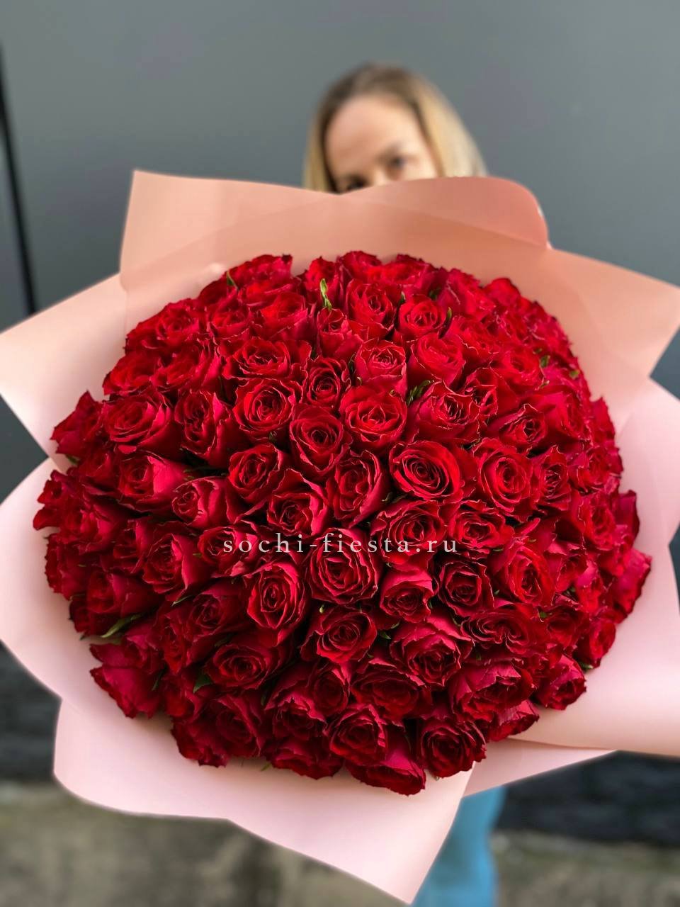 Сто один бутон в бело-розовой палитре создают объёмное облако цвета. Композиция впечатляет масштабом и наполняет пространство мягким сиянием лепестков.